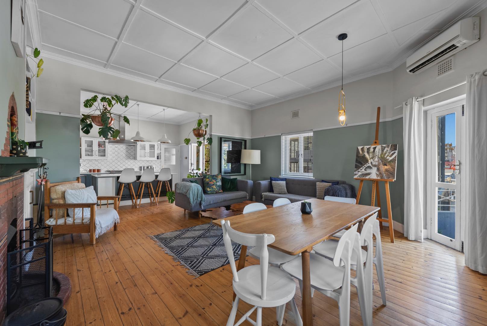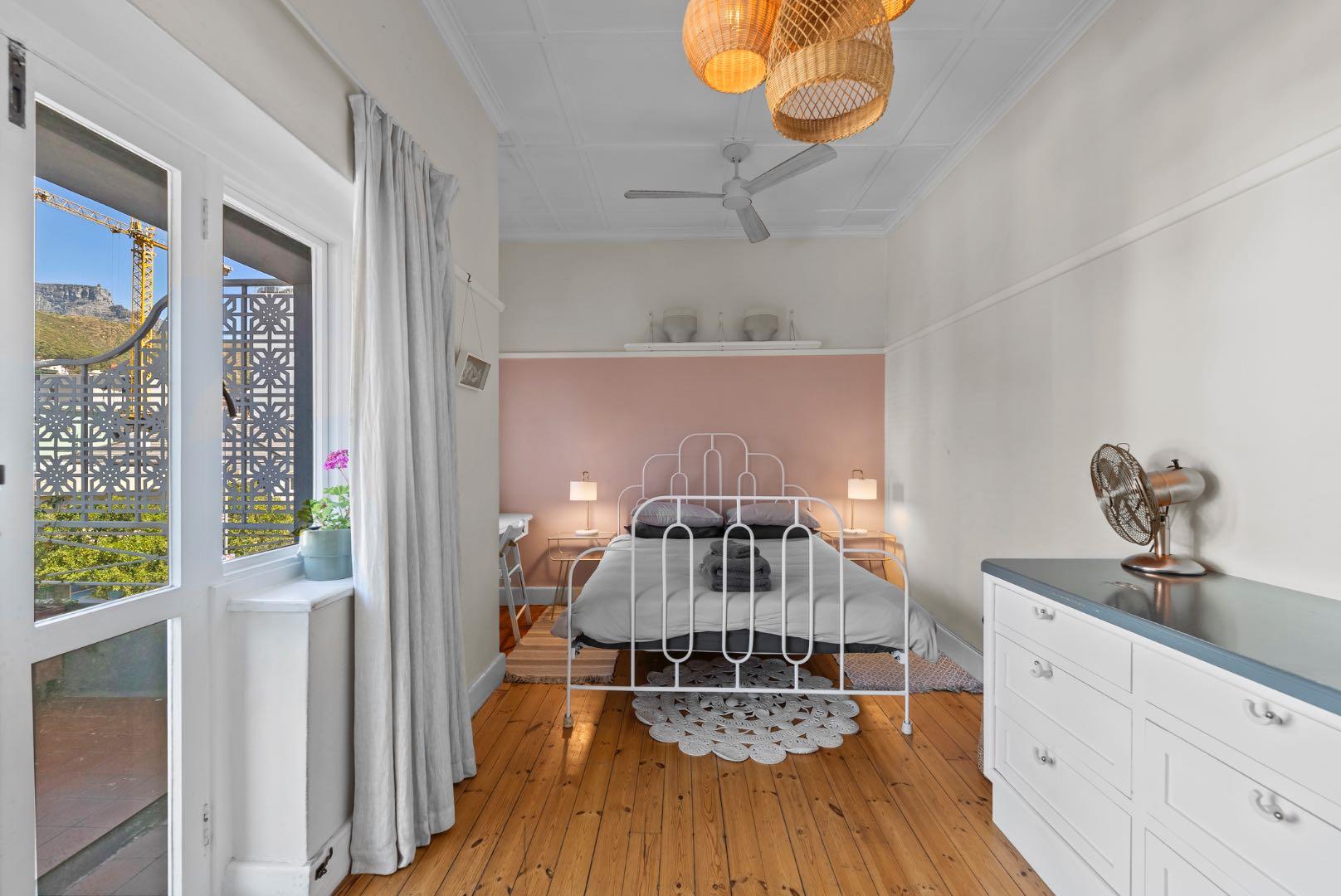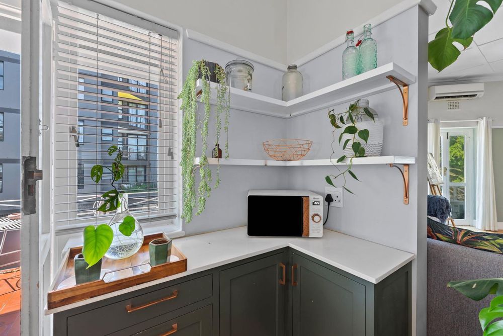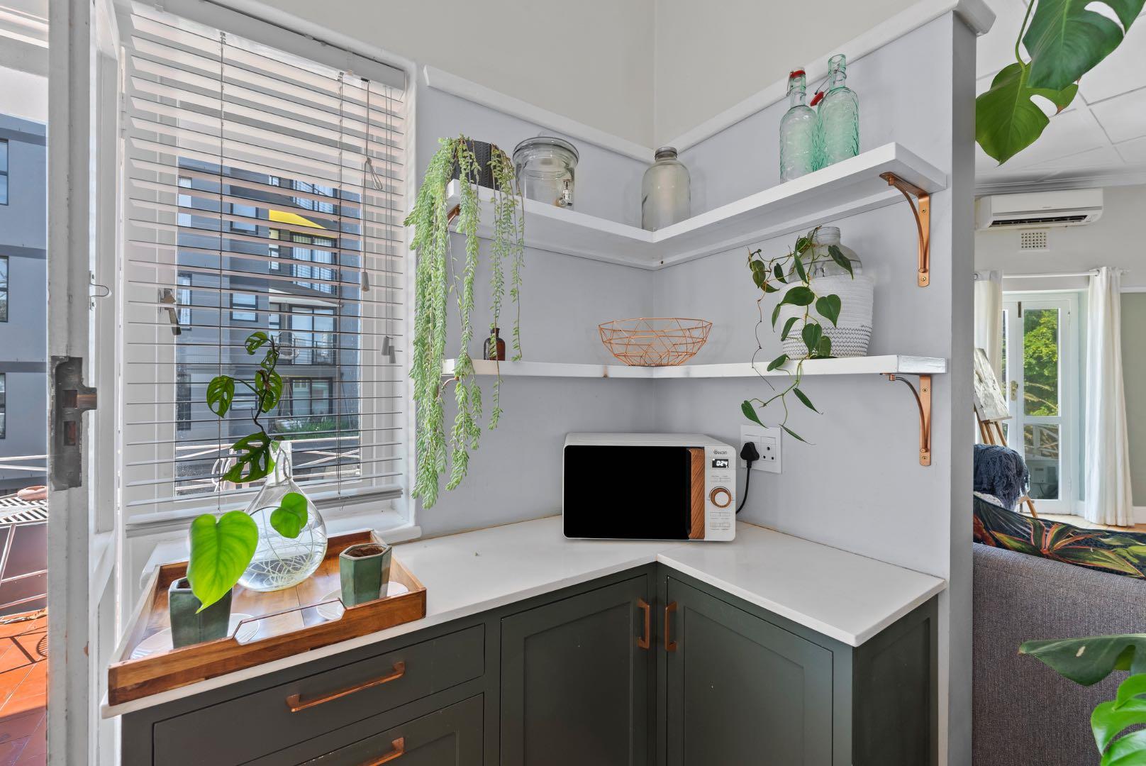 The living room is open plan to the dining room and served by a fireplace and air-conditioner. Built-in cabinetry creates additional space for interior and as book shelves. The balcony from the living rooms enjoy great views of Table Mountain & Signal Hill.