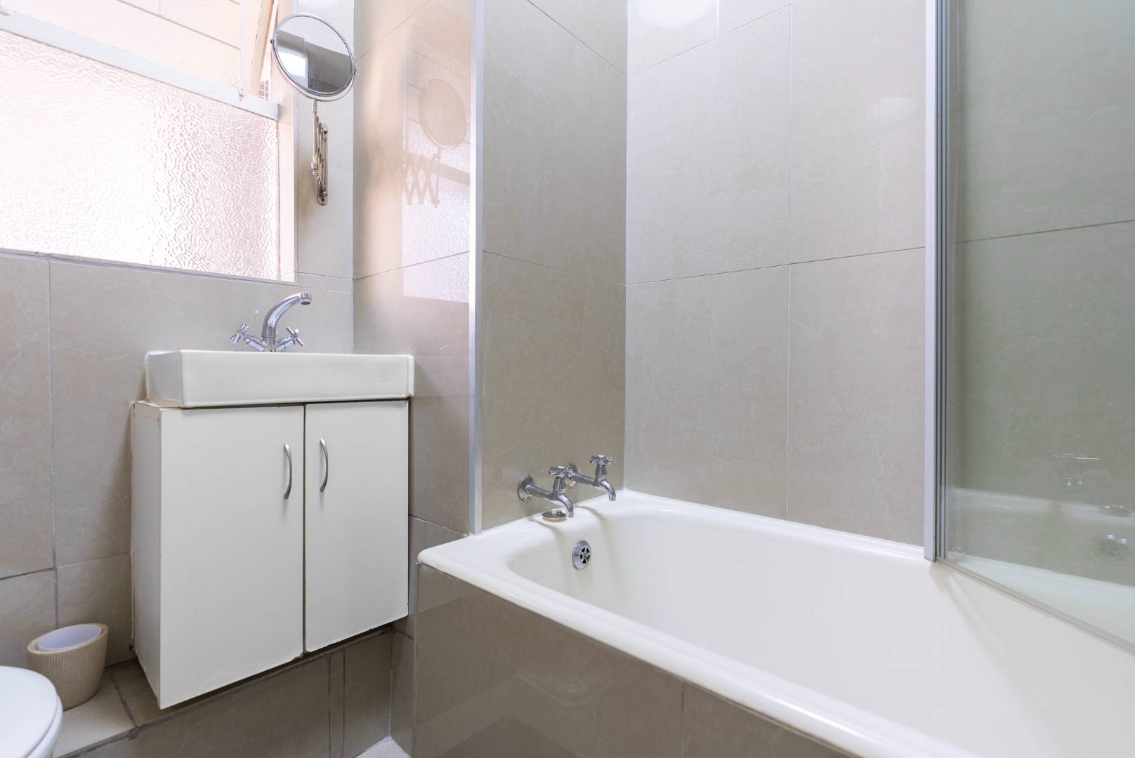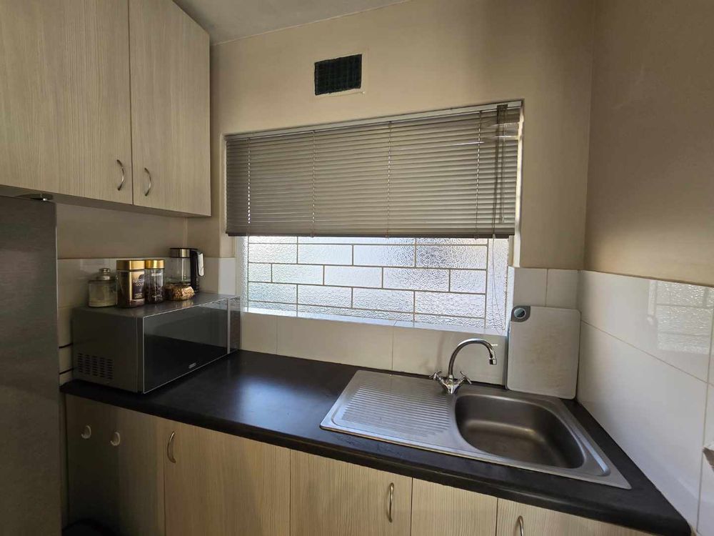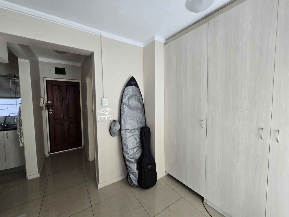 Open plan studio apartment with built-in cupboards, plumbed for one appliance, oven and hob included. gleaming porcelain tile floors, fully tiled bathroom with shower over the bath.