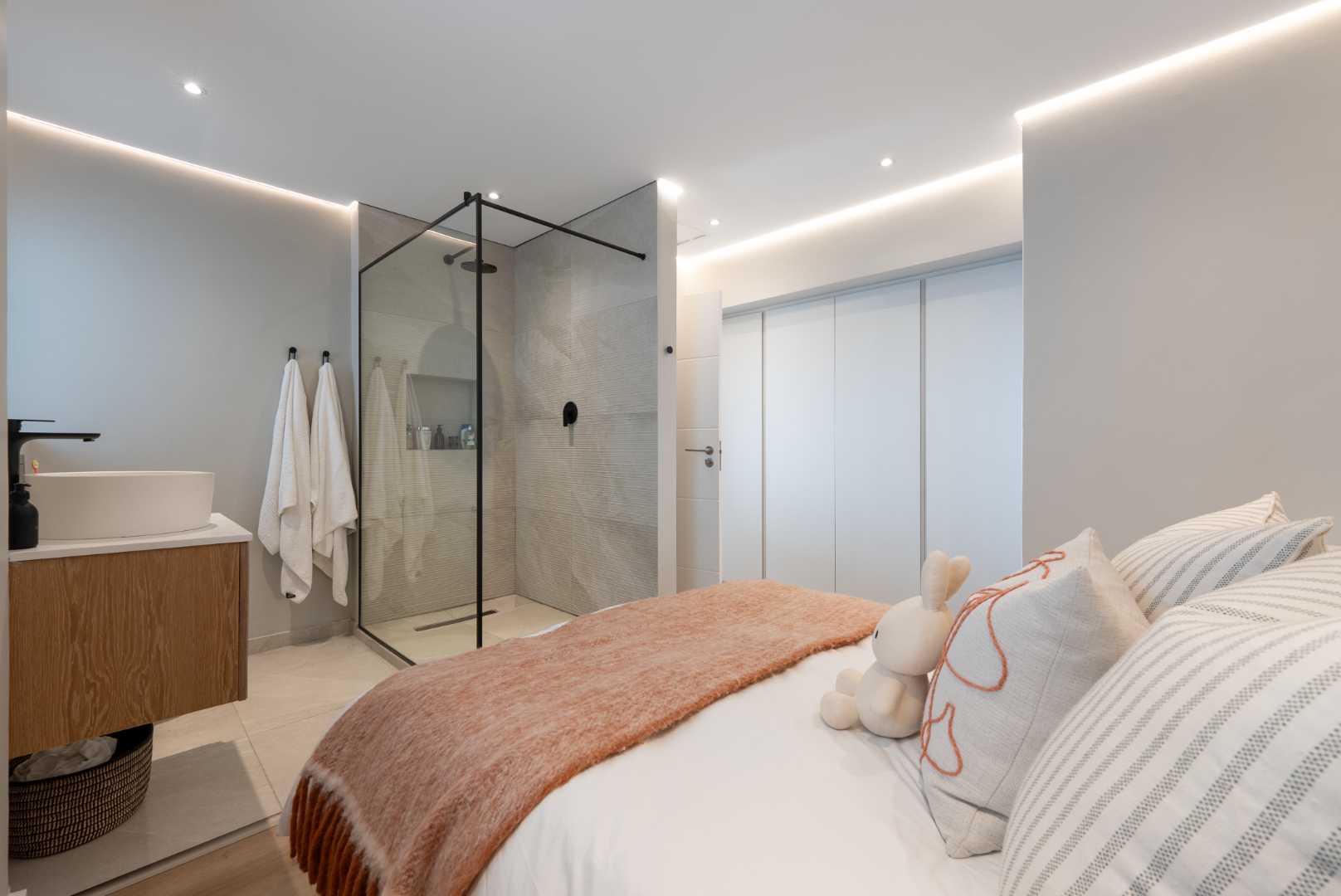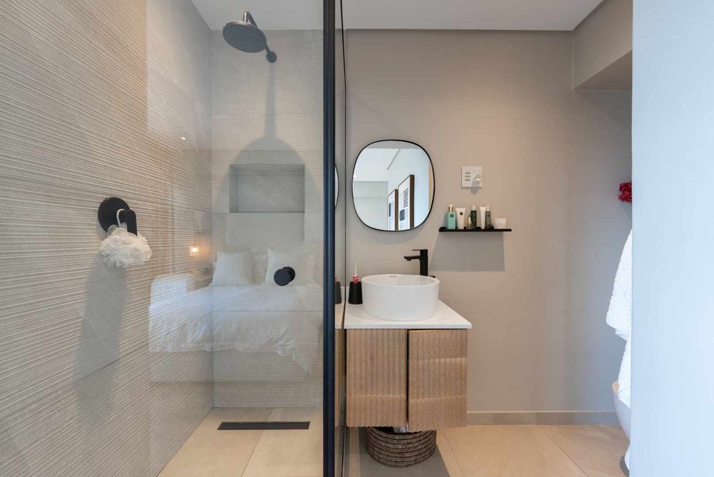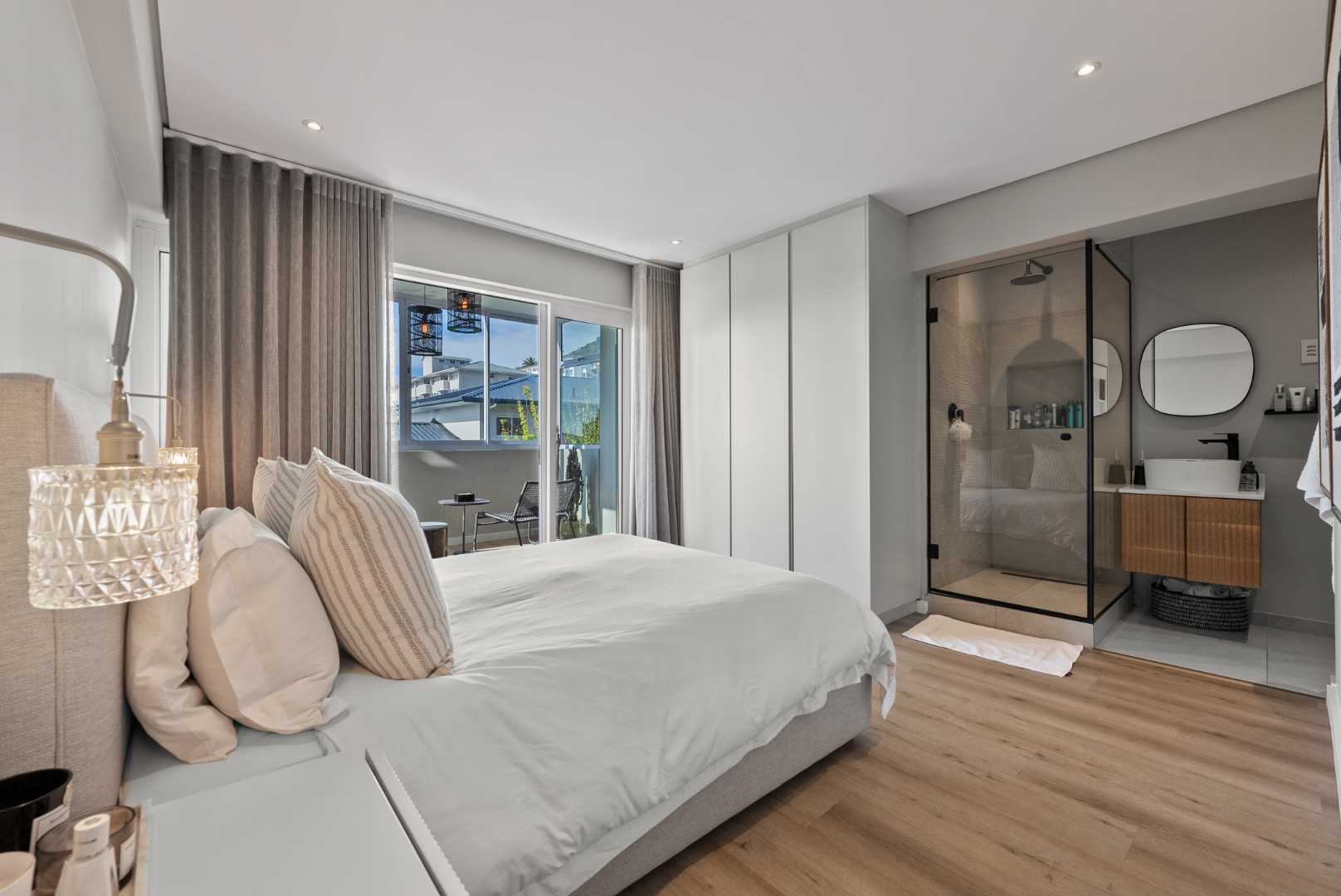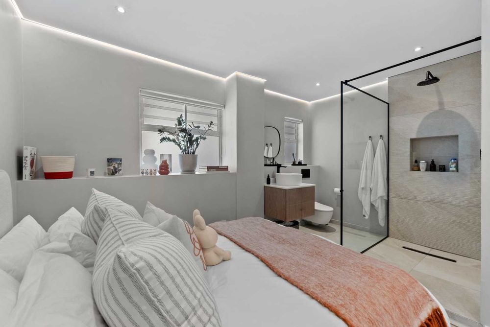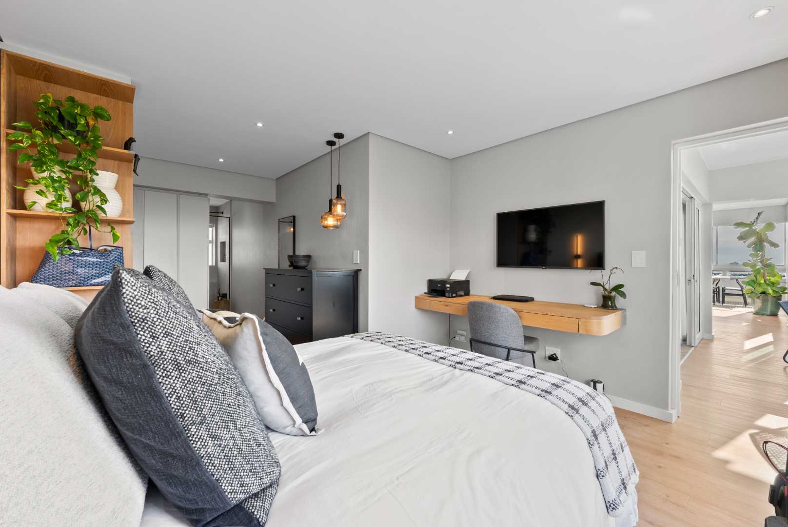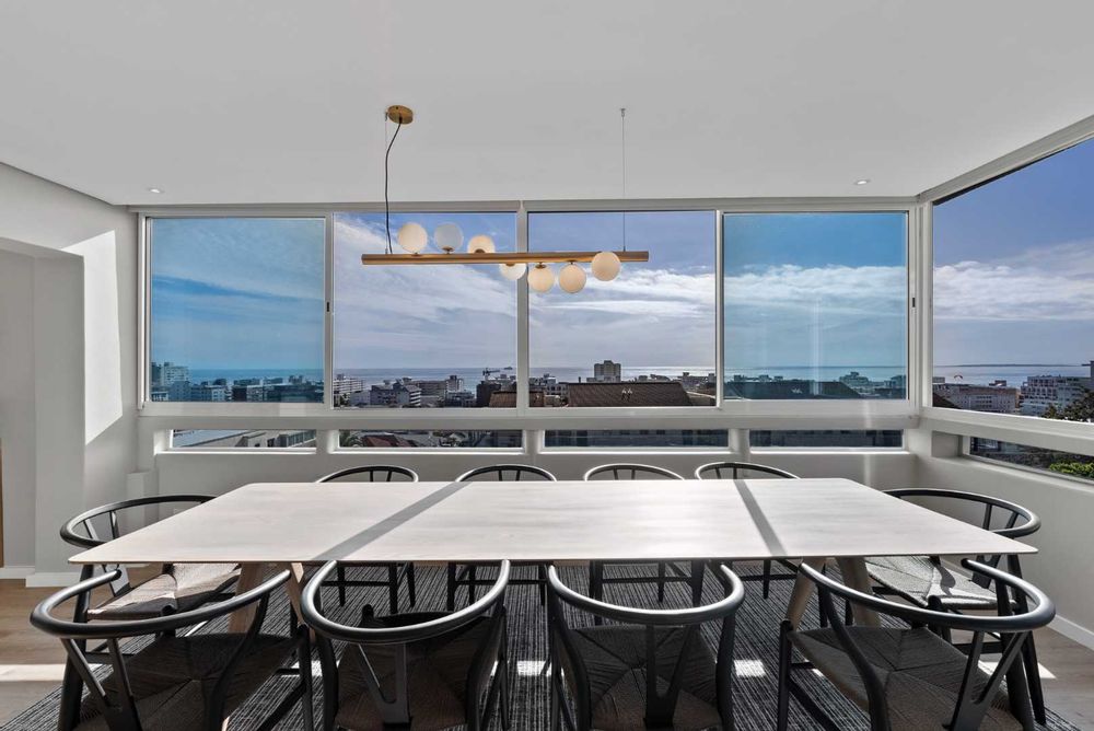 Modern three-bedroom apartment high up in Sea Point with stunning sea views. Each bedroom has its own en suite bathroom. The layout includes a sunroom and dining area with large windows throughout, creating an open and light-filled space. A 39sqm garage provides secure parking and storage.