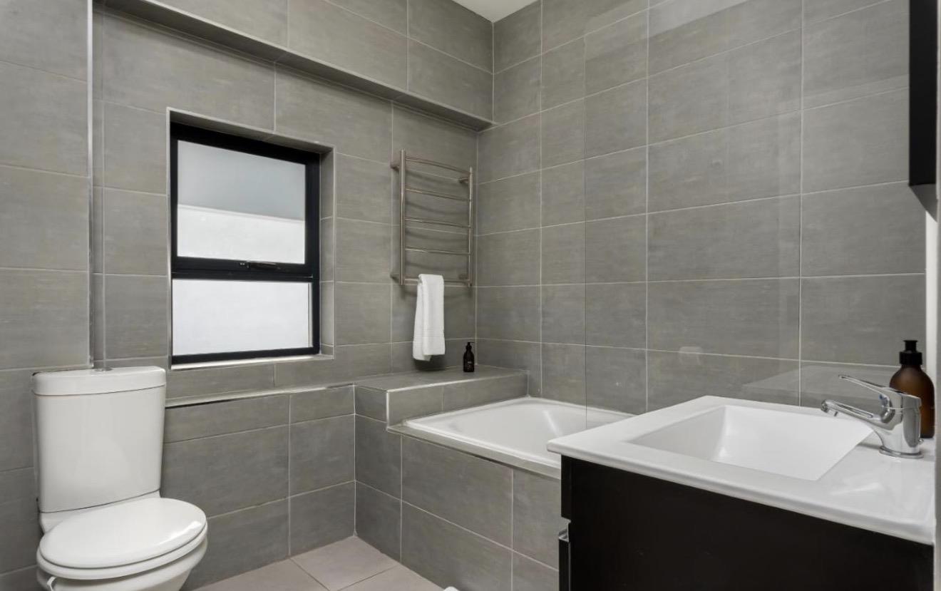 The lower-level bedroom enjoys direct access to the outdoor space, while the master suite boasts tranquil views of Signal Hill and Lion’s Head. Both bedrooms offer ample built-in cupboard space. The bathrooms are luxuriously appointed with both a bath and shower, and the master bedroom further benefits from a separate private toilet.