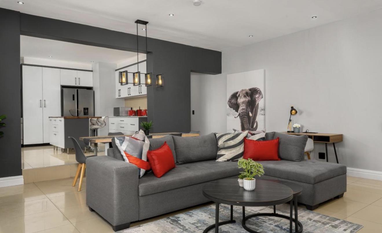 The open-plan kitchen and living area is generous in scale and effortlessly elegant, ideal for entertaining on any level. Full air-conditioning throughout ensures year-round comfort, while a backup inverter provides peace of mind during load shedding.