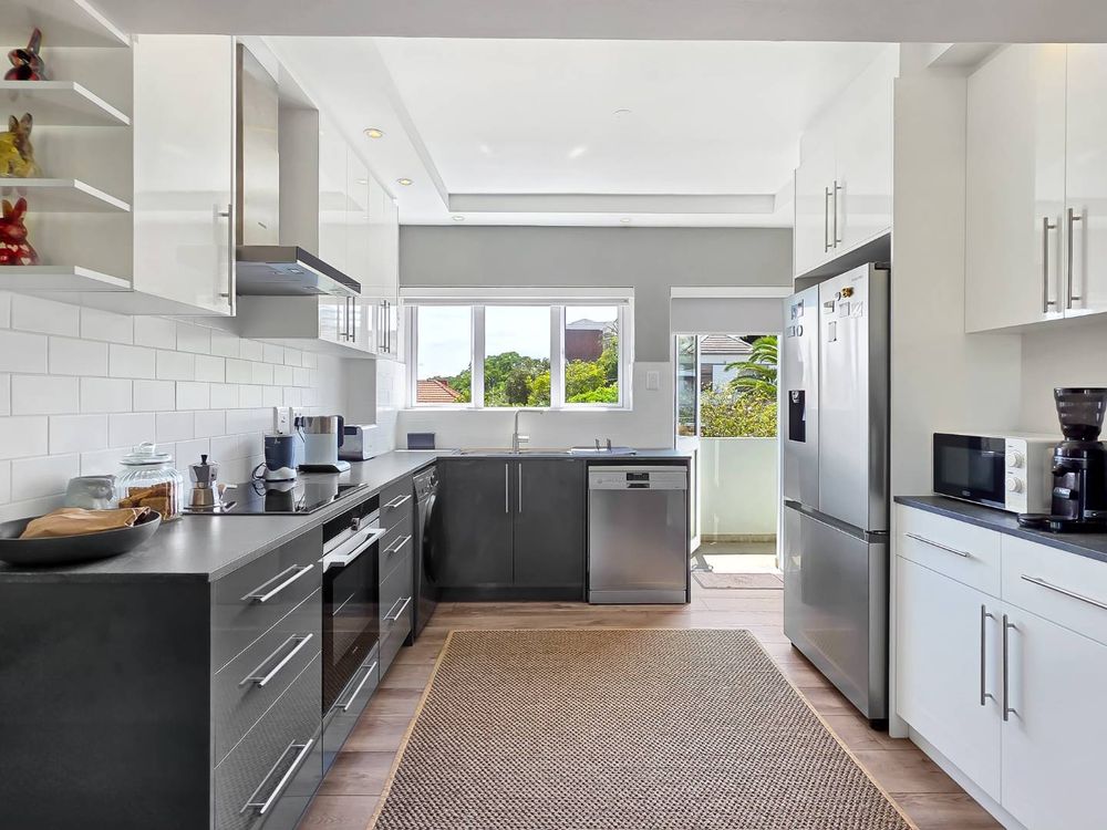 Open plan kitchen leads to lounge and dining area with sliding glass doors to balcony