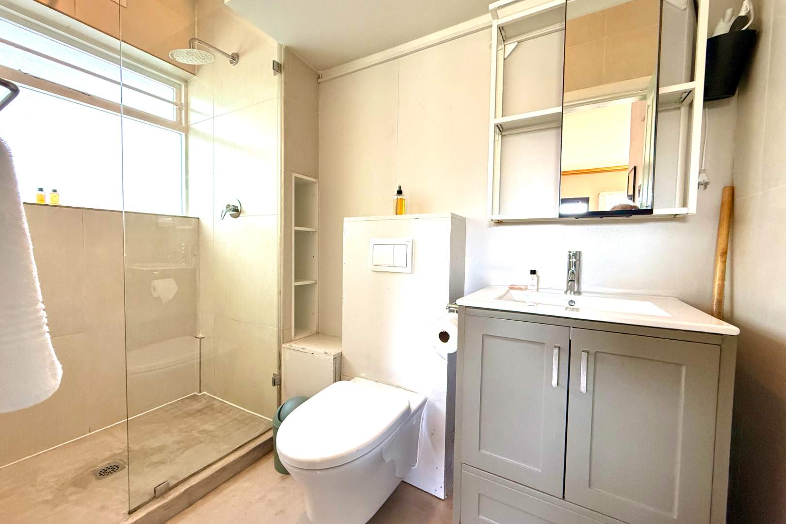 The spacious bathroom is equipped with a shower, toilet, and vanity with a fitted basin. Intelligent design incorporates convenient shelving for toiletries and other essentials.