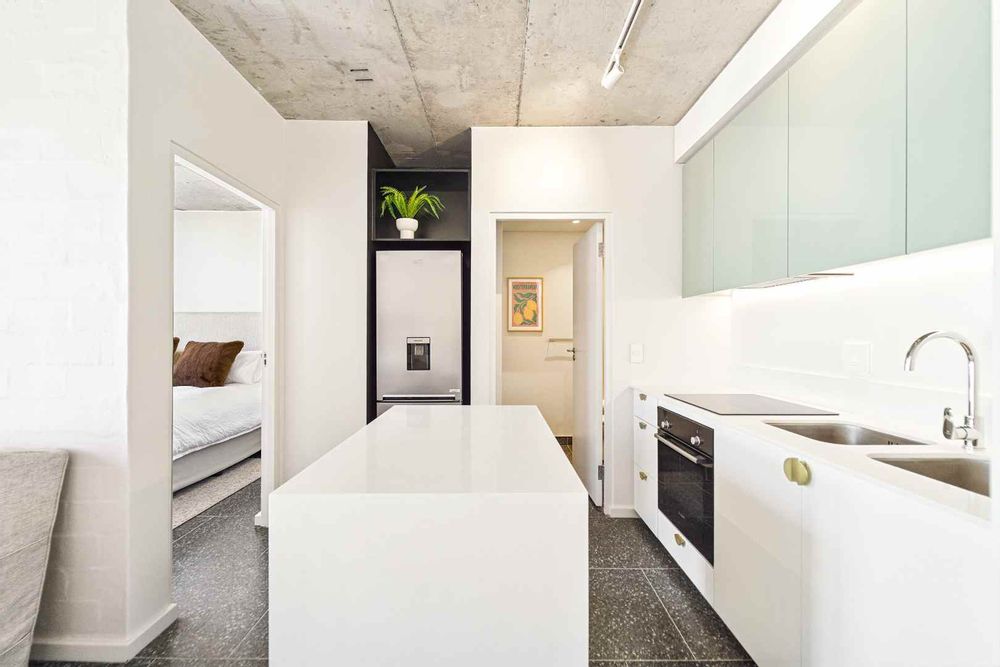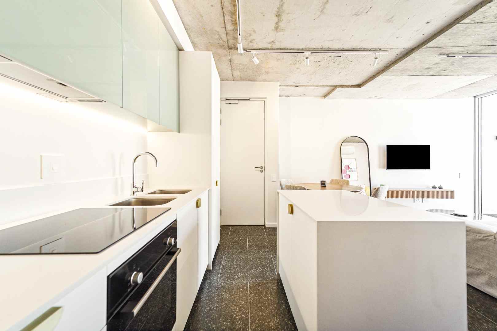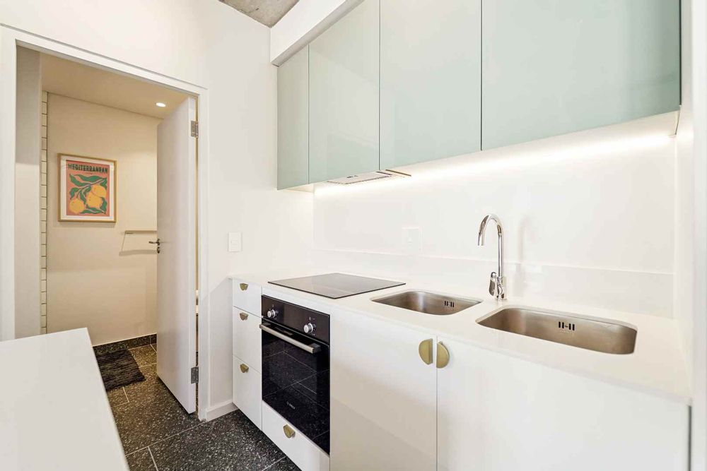A well-equipped kitchen featuring integrated appliances and considered joinery — designed to maximise space and light