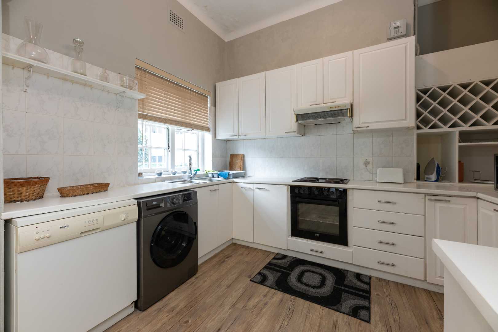 Fully equipped kitchen with all essential appliances, including dishwasher, washing machine & tumble drier.