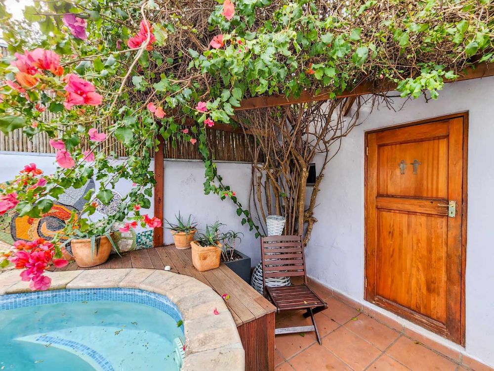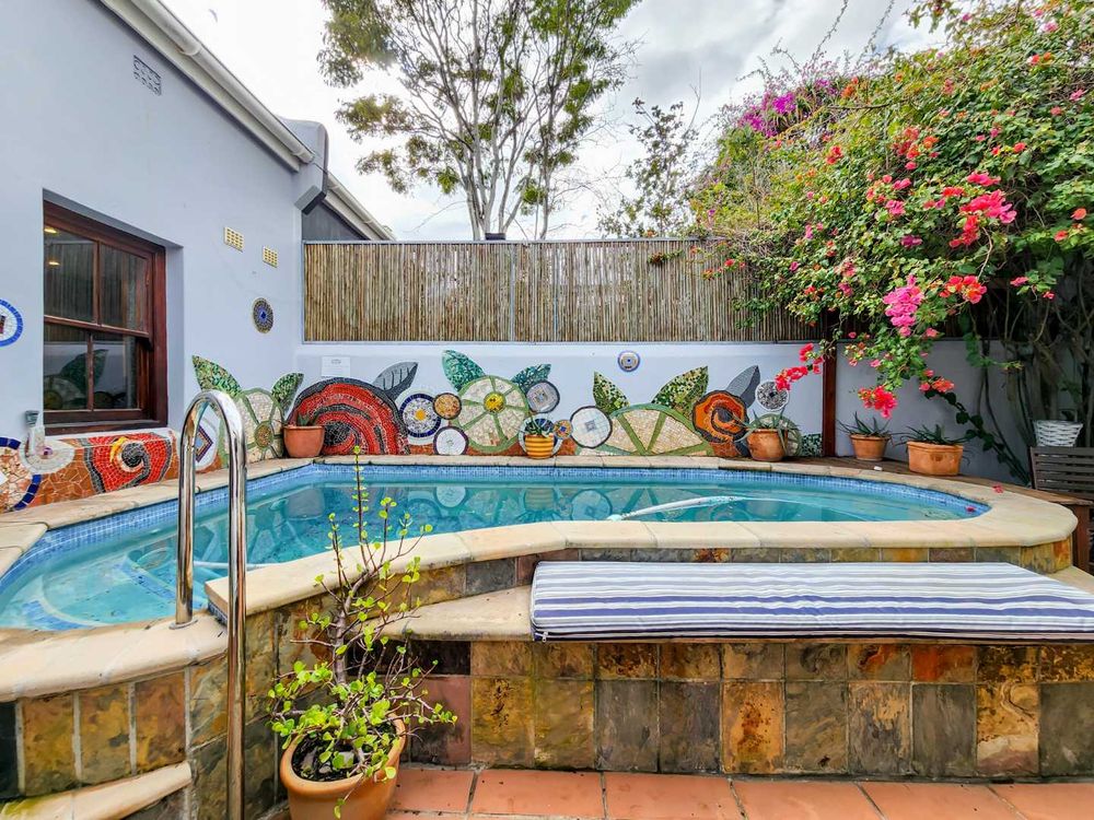 Back garden with pool and store room and toilet facility.