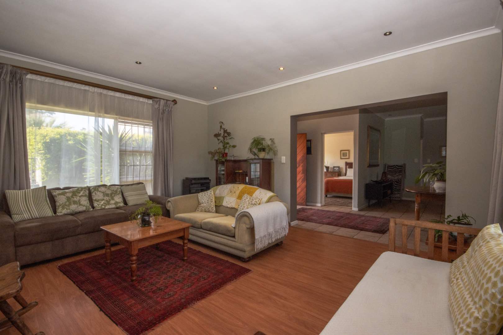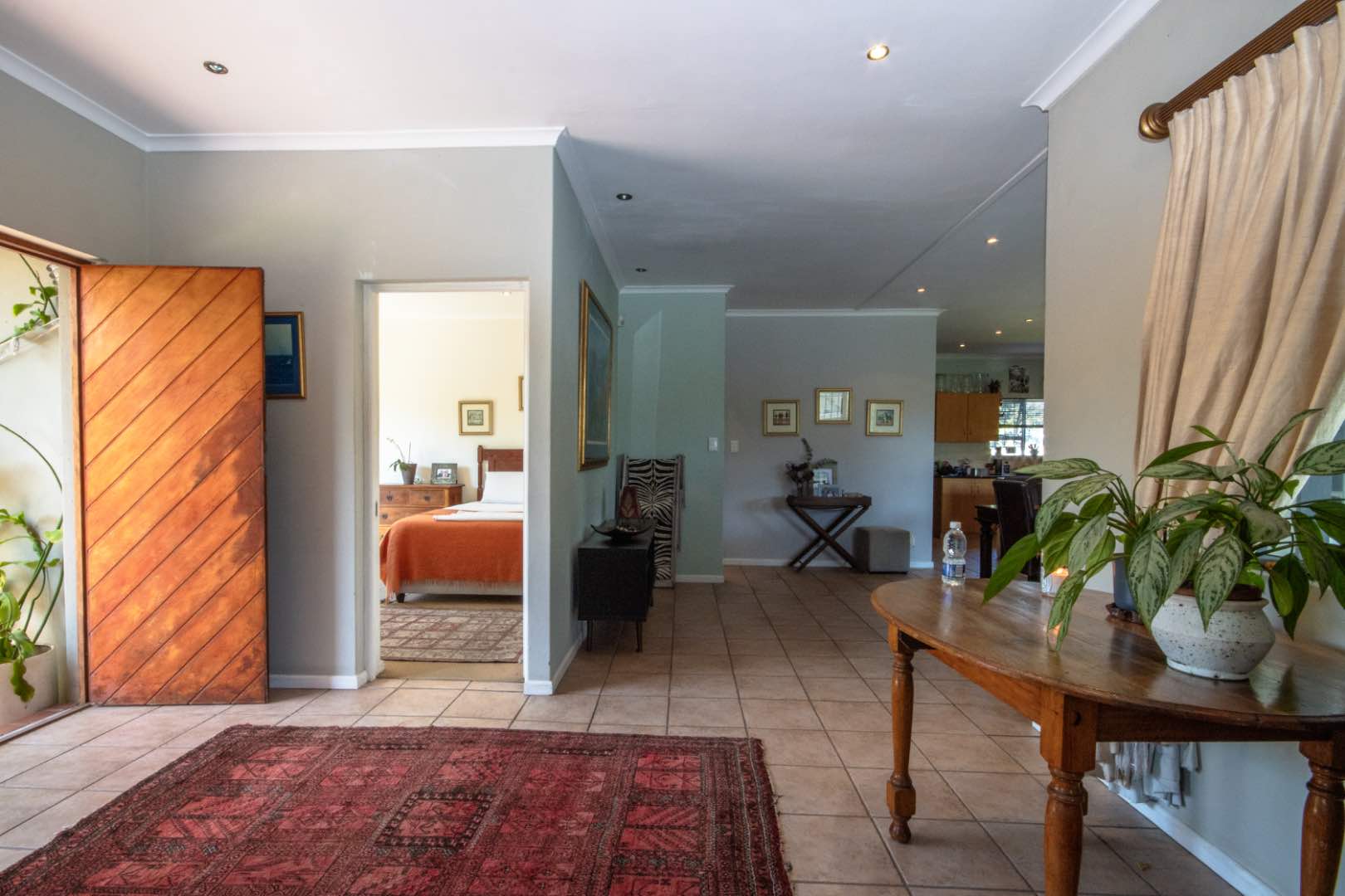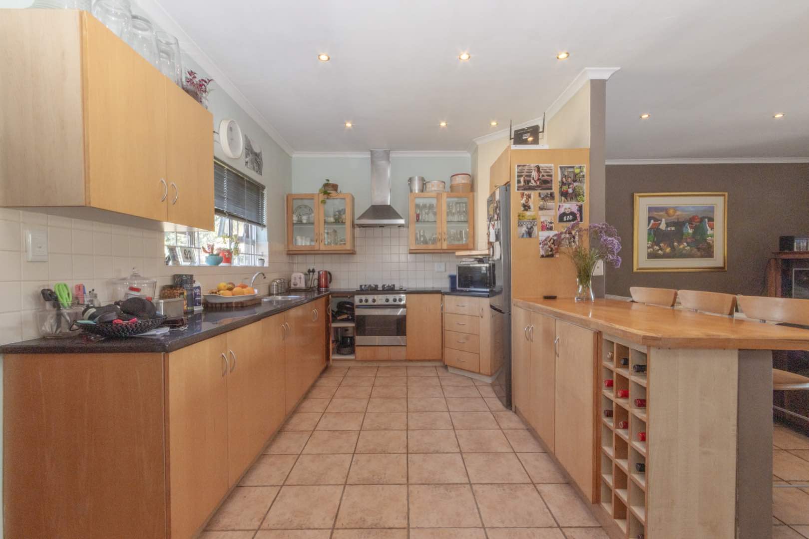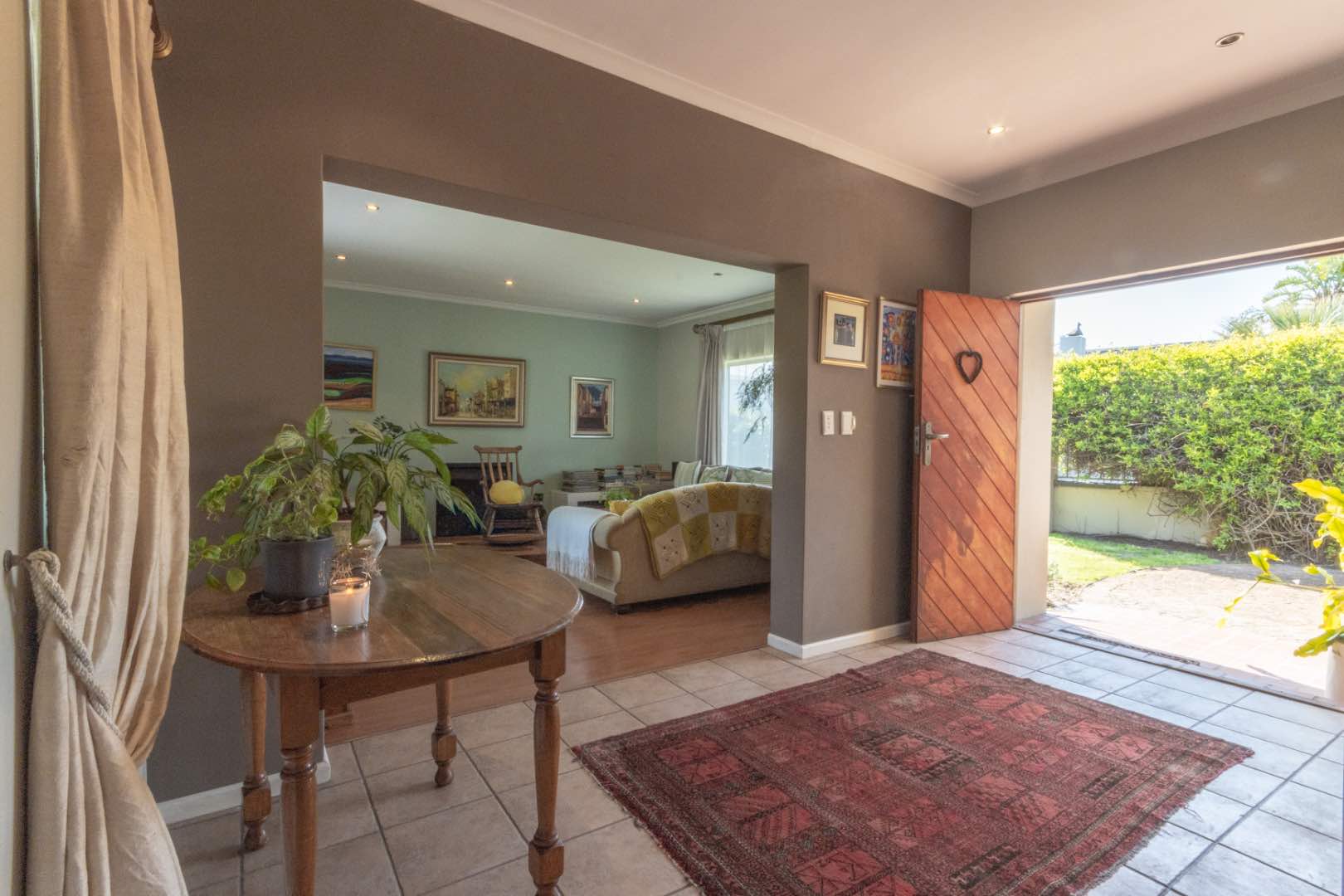 Inside, the home features 4 generously sized bedrooms, 2 bathrooms, a guest loo, study and 3 versatile reception rooms that can be adapted for family living, entertaining, or working from home. The main en-suite bedroom features a dressing room and opens onto the expansive, north-facing, lush garden. The kitchen has ample cupboards, a gas hob with an electric oven, and the countertops are a combination of solid wood and black granite. There is a separate scullery with sufficient appliance space. The main entertainment area boasts a feature fireplace, creating a warm and welcoming atmosphere, while sliding doors open out onto a large covered patio that flows effortlessly into the garden — perfect for year-round gatherings.