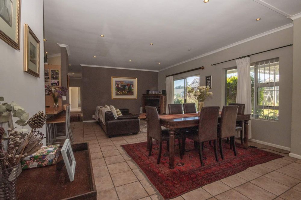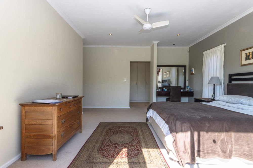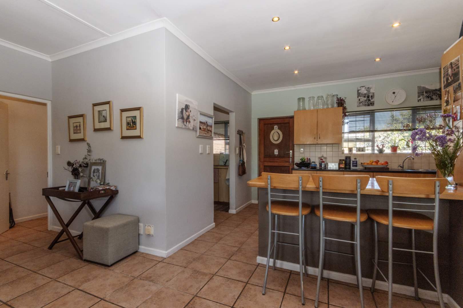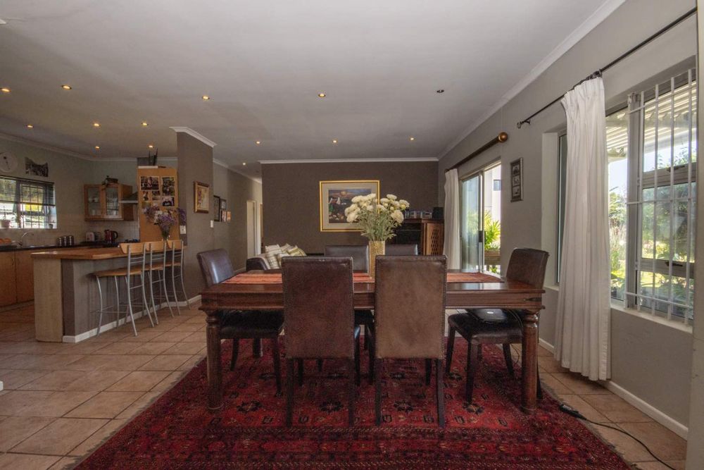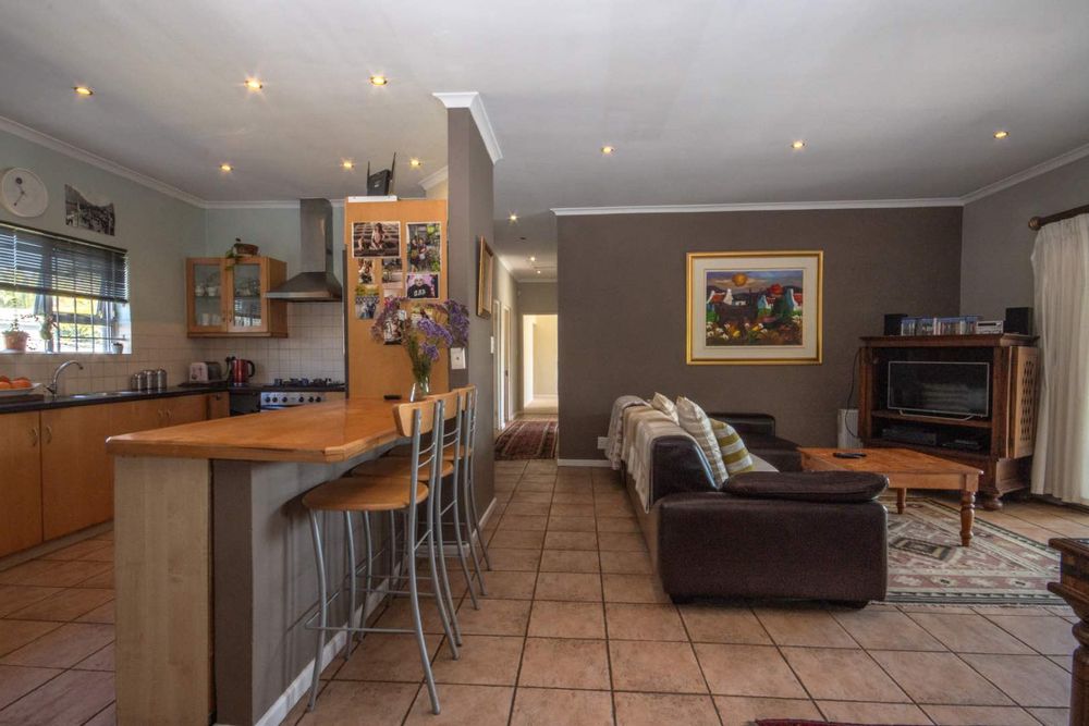 Inside, the home features 4 generously sized bedrooms, 2 bathrooms, a guest loo, study and 3 versatile reception rooms that can be adapted for family living, entertaining, or working from home. The main en-suite bedroom features a dressing room and opens onto the expansive, north-facing, lush garden. The kitchen has ample cupboards, a gas hob with an electric oven, and the countertops are a combination of solid wood and black granite. There is a separate scullery with sufficient appliance space. The main entertainment area boasts a feature fireplace, creating a warm and welcoming atmosphere, while sliding doors open out onto a large covered patio that flows effortlessly into the garden — perfect for year-round gatherings.