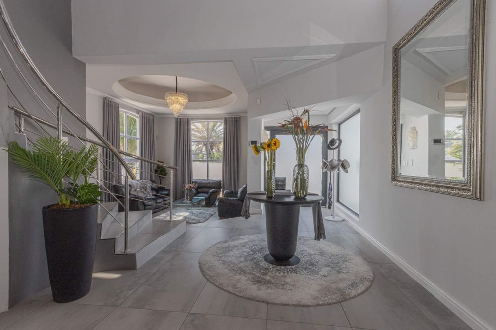 Outside, the curved architecture embraces a shimmering pool and manicured faux-lawn, creating the ultimate backdrop for year-round gatherings. The integrated entertainment areas make this home ideal for both intimate evenings and large-scale gatherings.