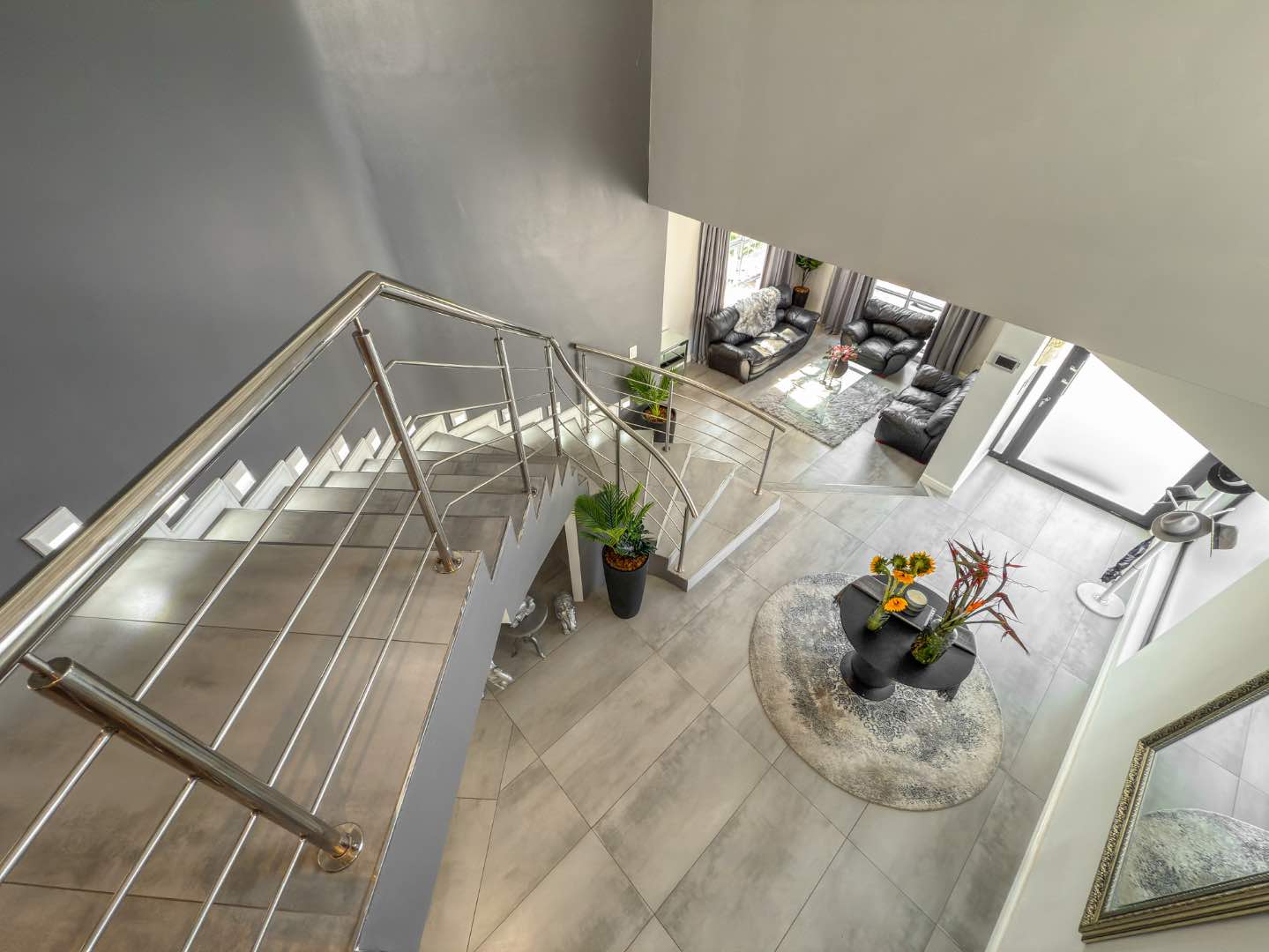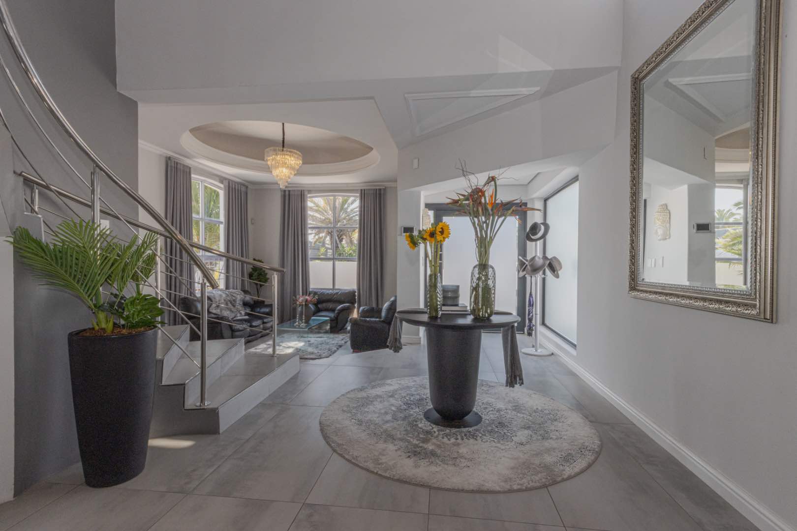 - A double-volume entrance foyer with a curved staircase