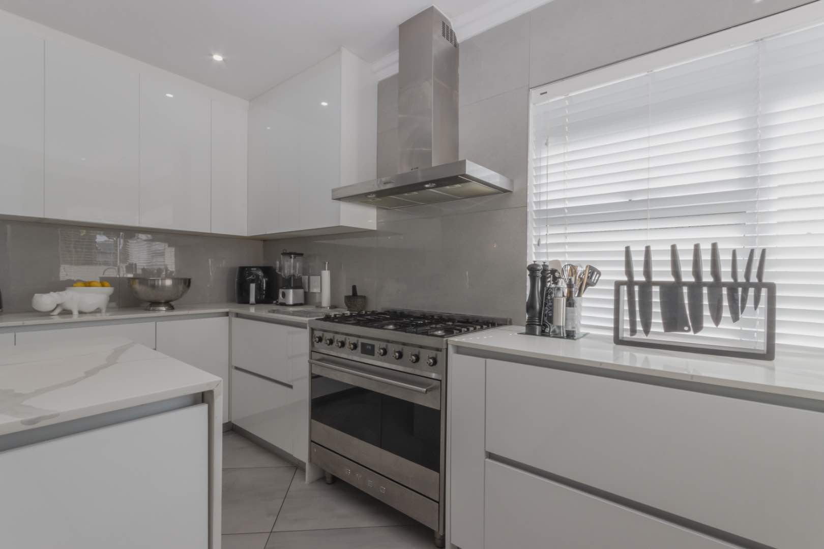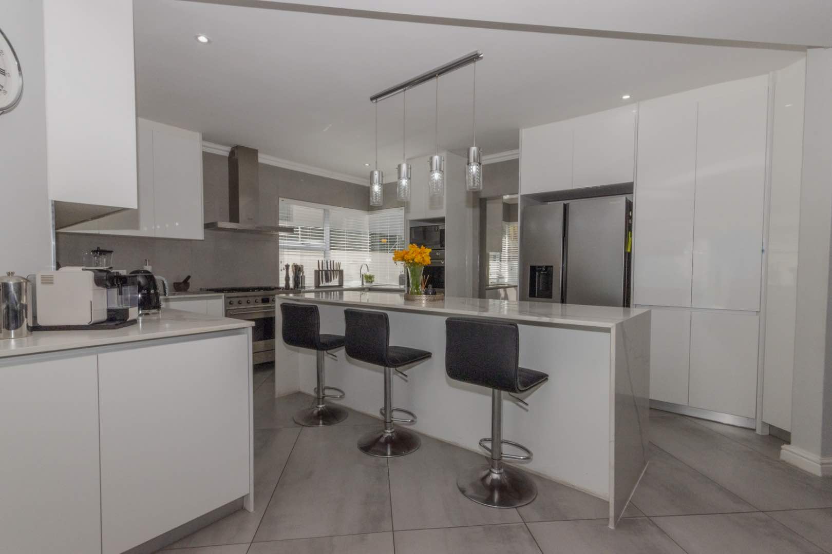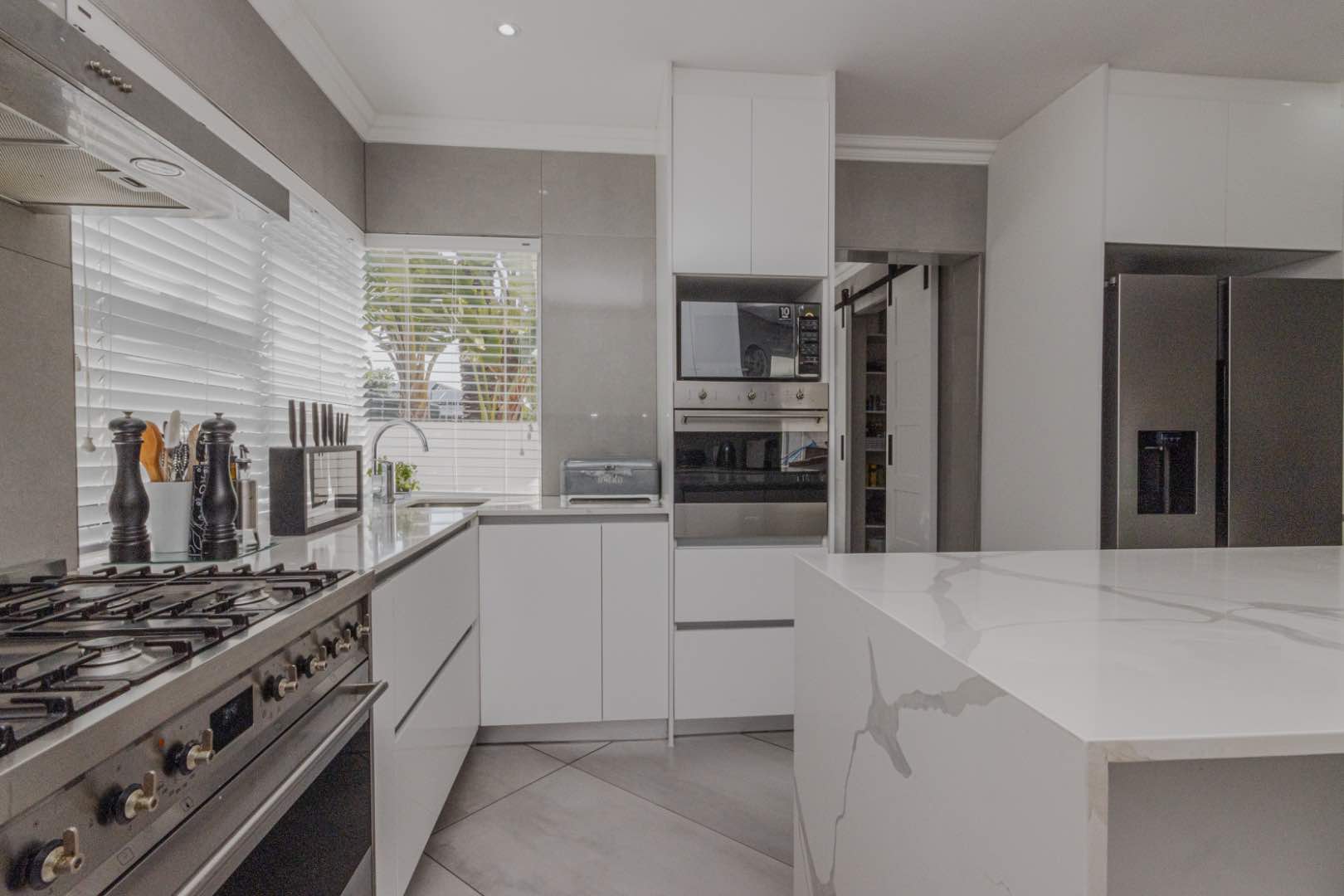 - A large open-plan kitchen with porcelain tops