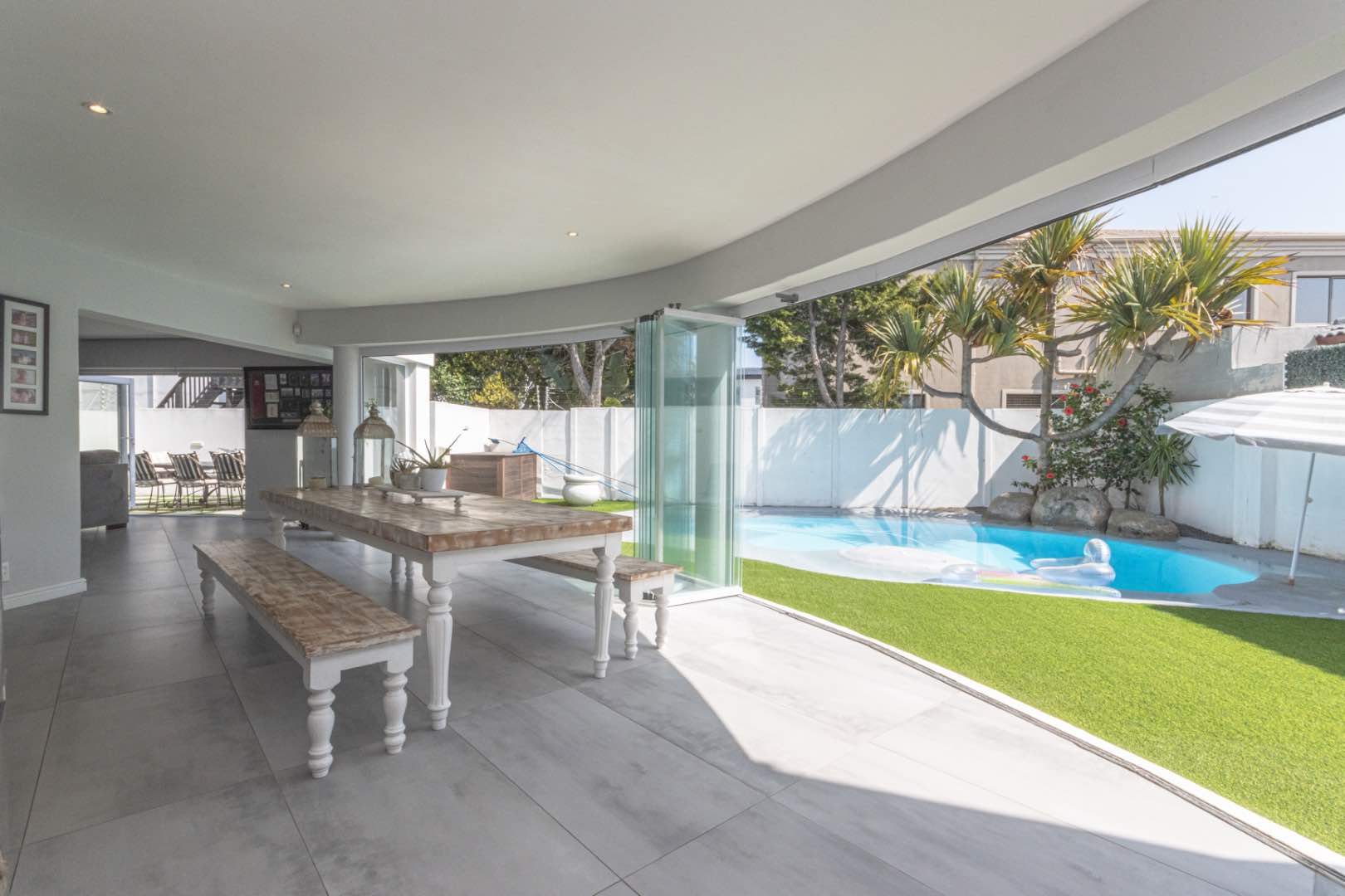 - An indoor braai area, with a casual dining area, with stacking doors opening onto the pool area