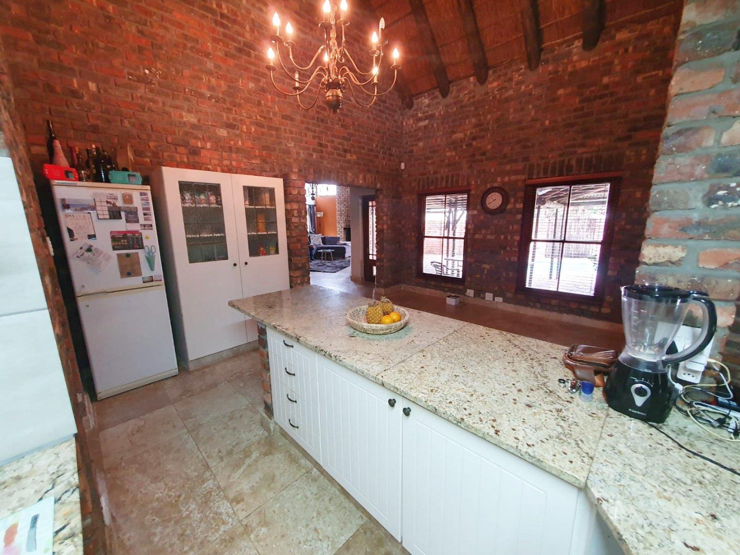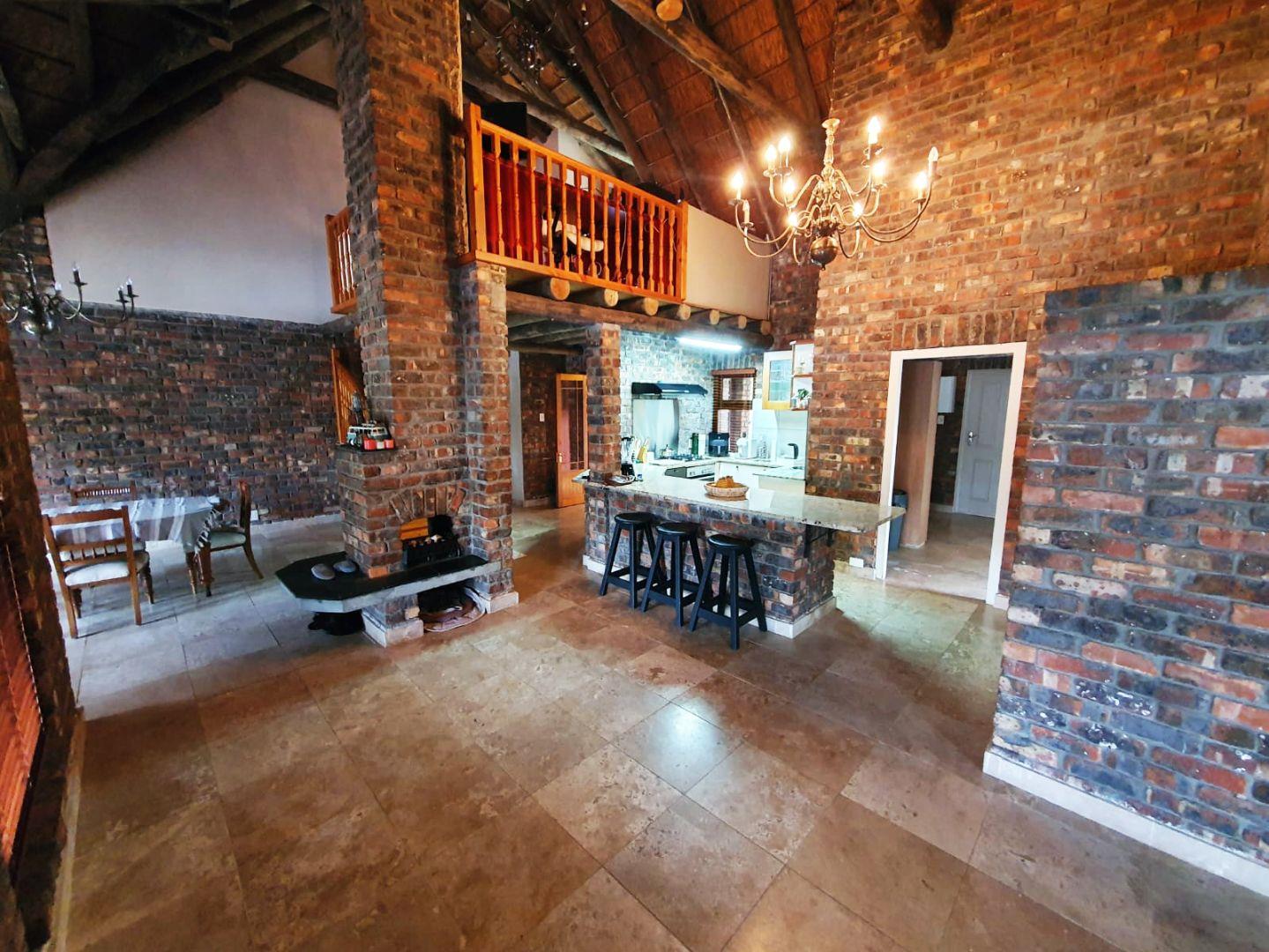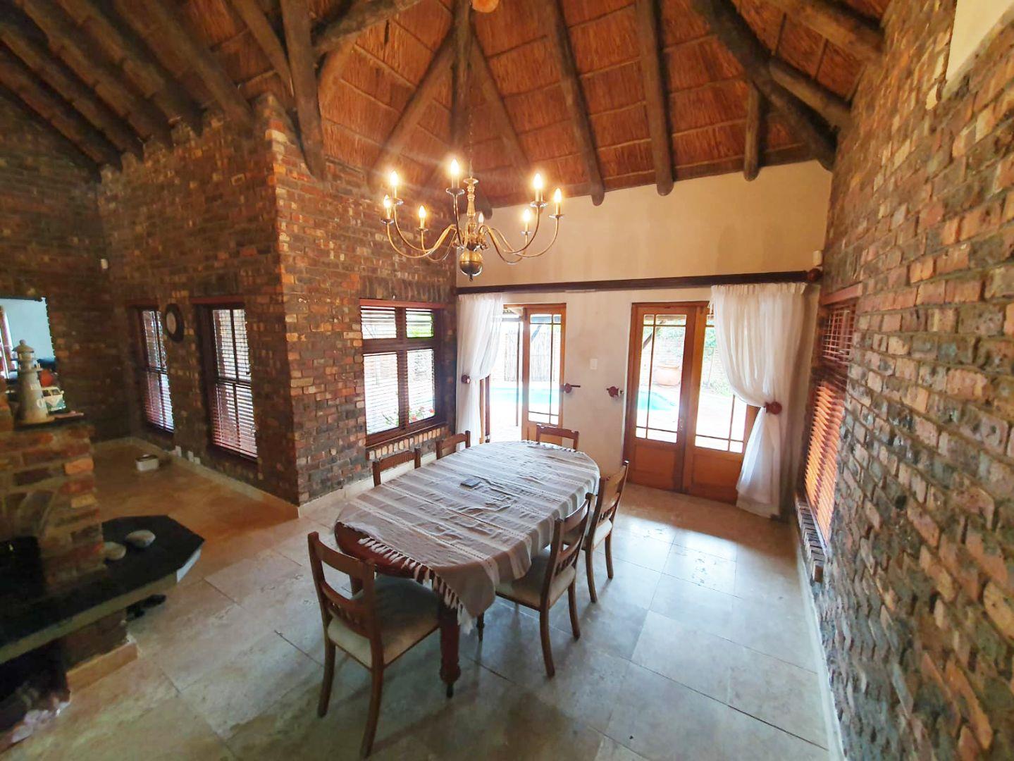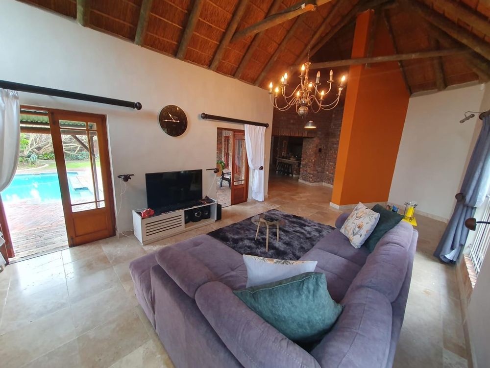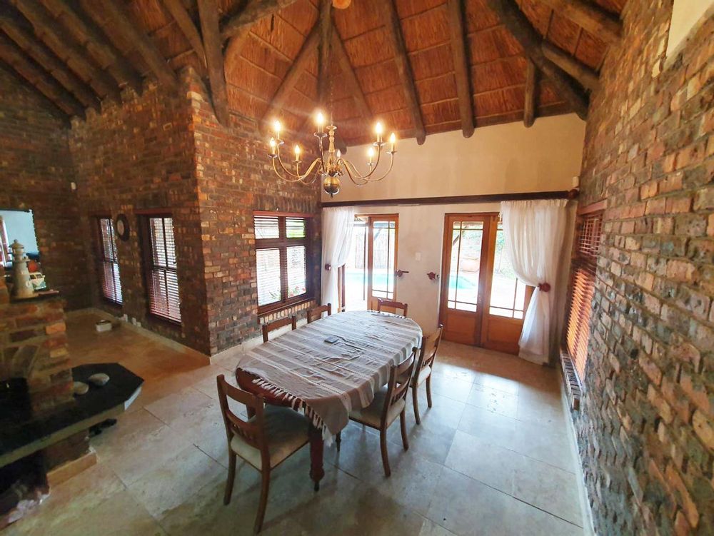 The Main house contains 4 bedrooms, 4 bathrooms with warm face brick throughout to compliment the thatch. The flow extends to the stoep or large patio/braai area onto the pool, there is a large Plot and loads of potential.