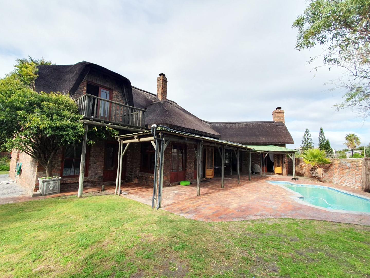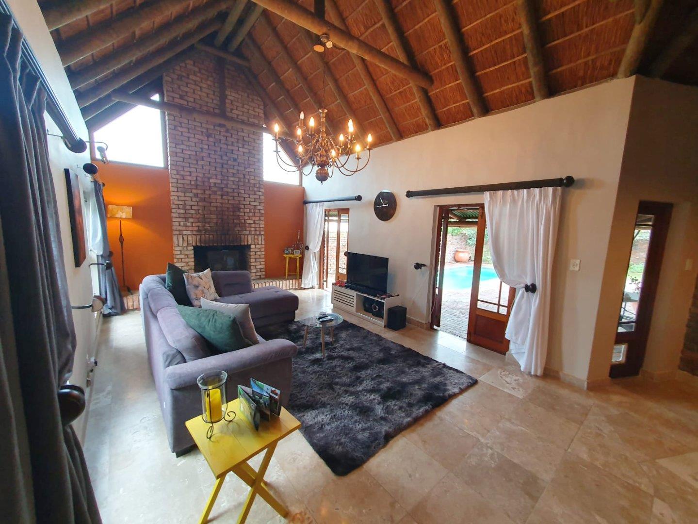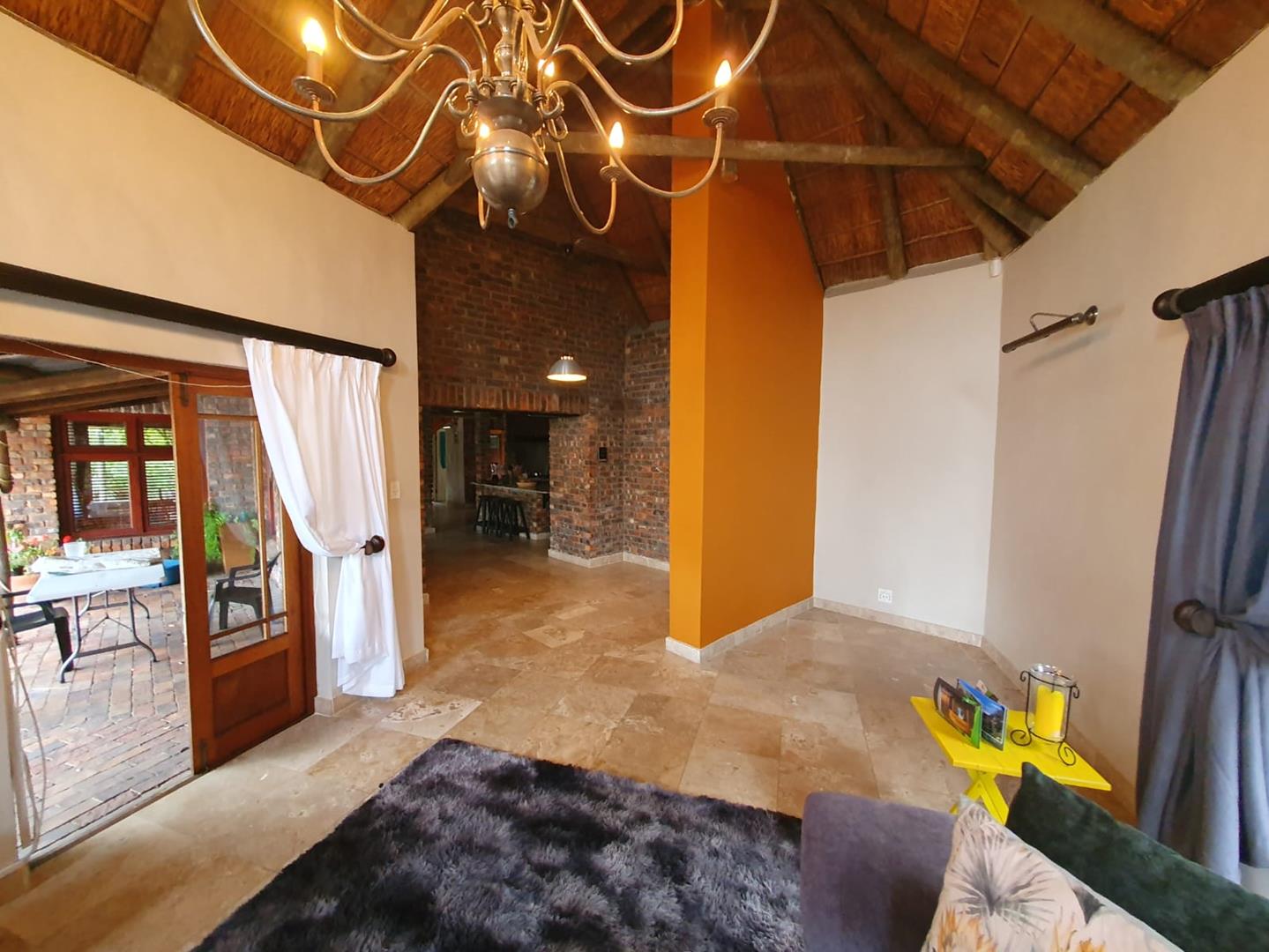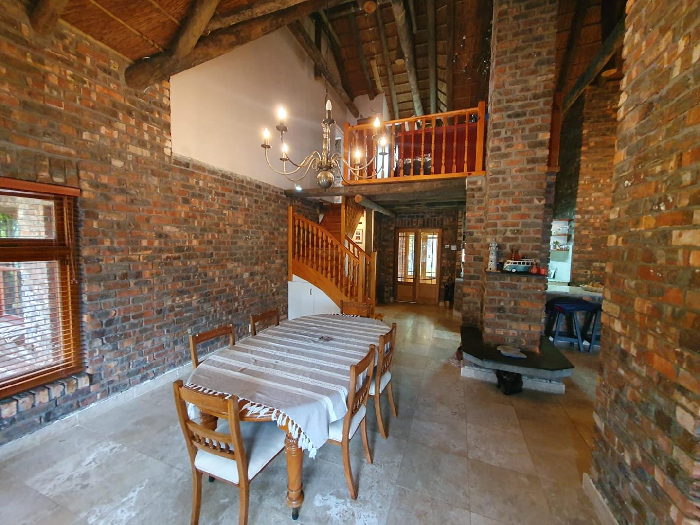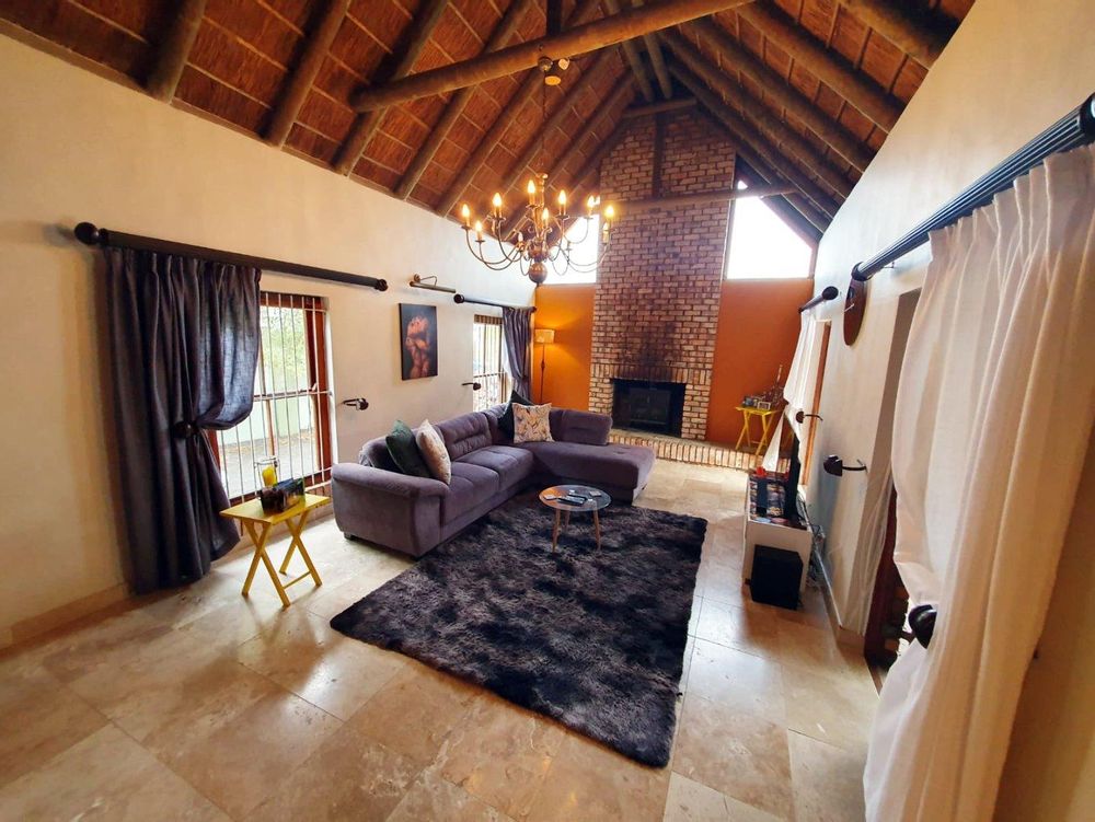 The Main house contains 4 bedrooms, 4 bathrooms with warm face brick throughout to compliment the thatch. The flow extends to the stoep or large patio/braai area onto the pool, there is a large Plot and loads of potential.