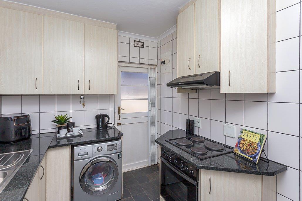 The practical kitchen is equipped with an oven and hob and opens onto a private garden—perfect for outdoor entertaining, weekend braais, or simply enjoying a quiet green space.