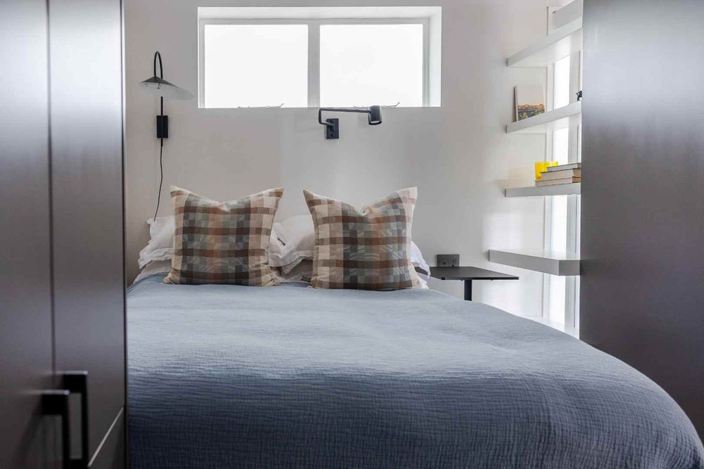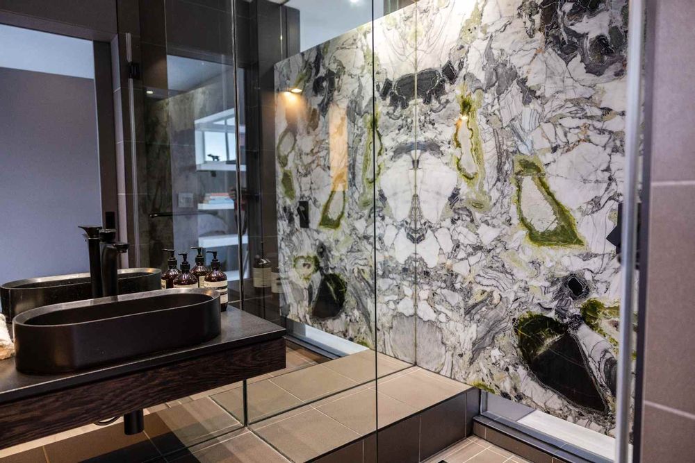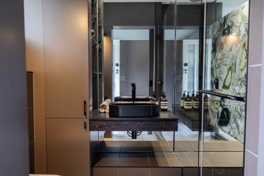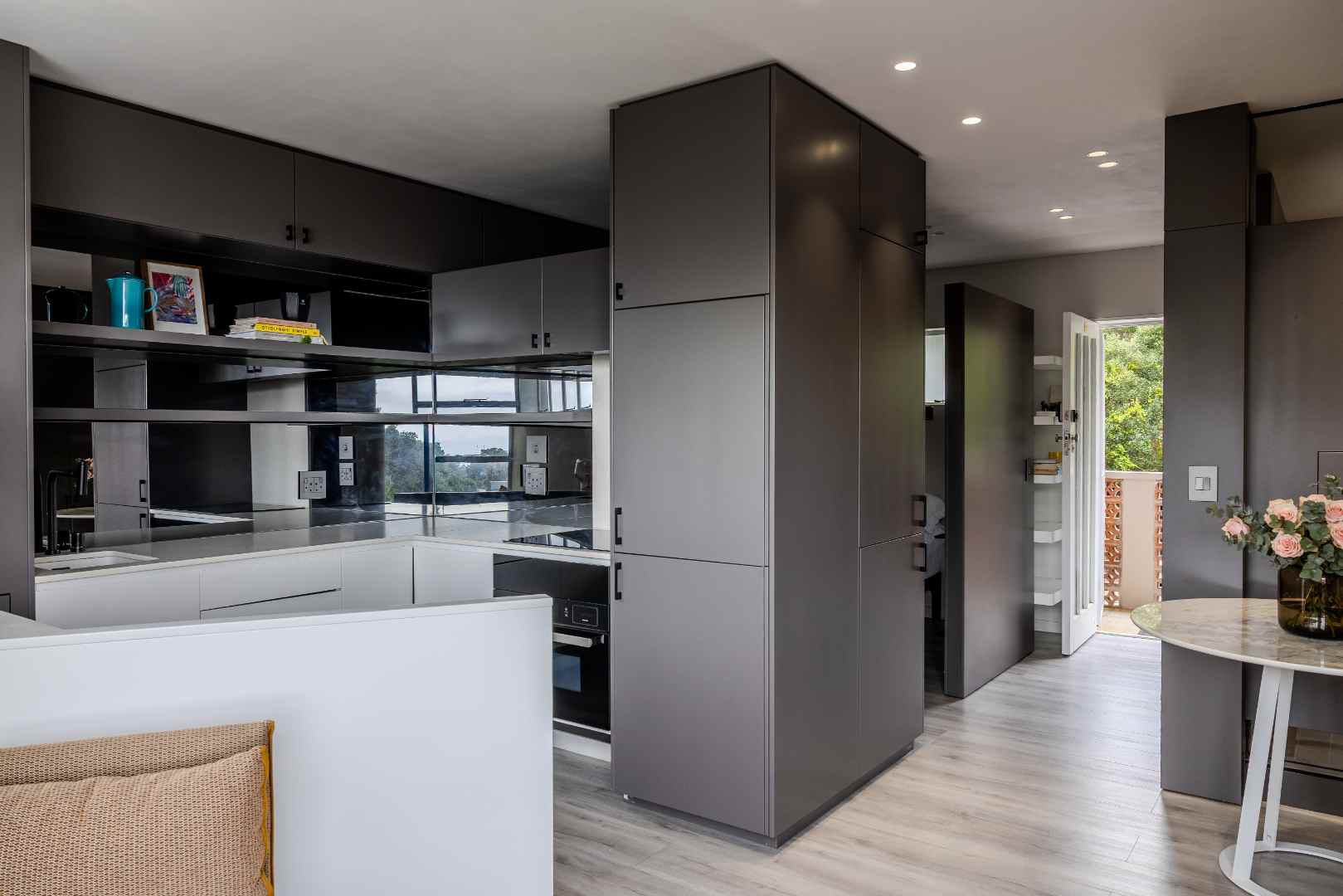 The open-plan living, dining, and kitchen area is bathed in natural light, creating a warm, uplifting atmosphere while framing sweeping views across the harbour and city. Bespoke joinery throughout provides abundant storage, enhancing the seamless, modern design.