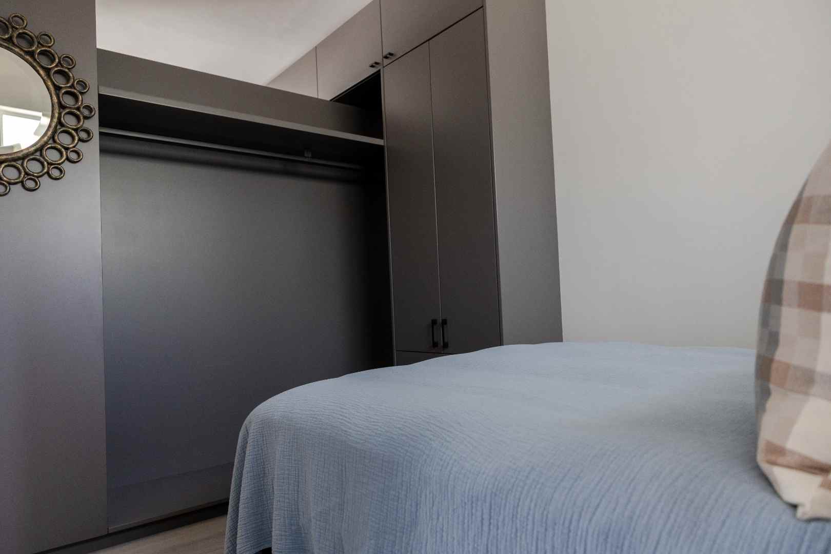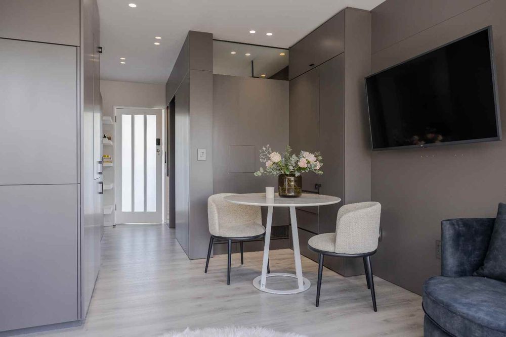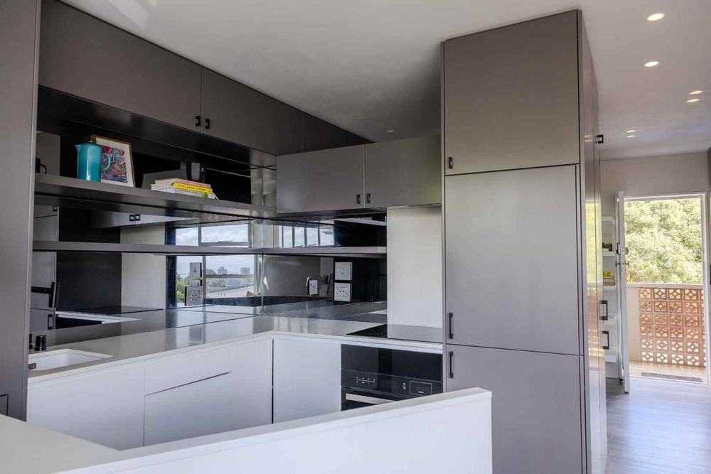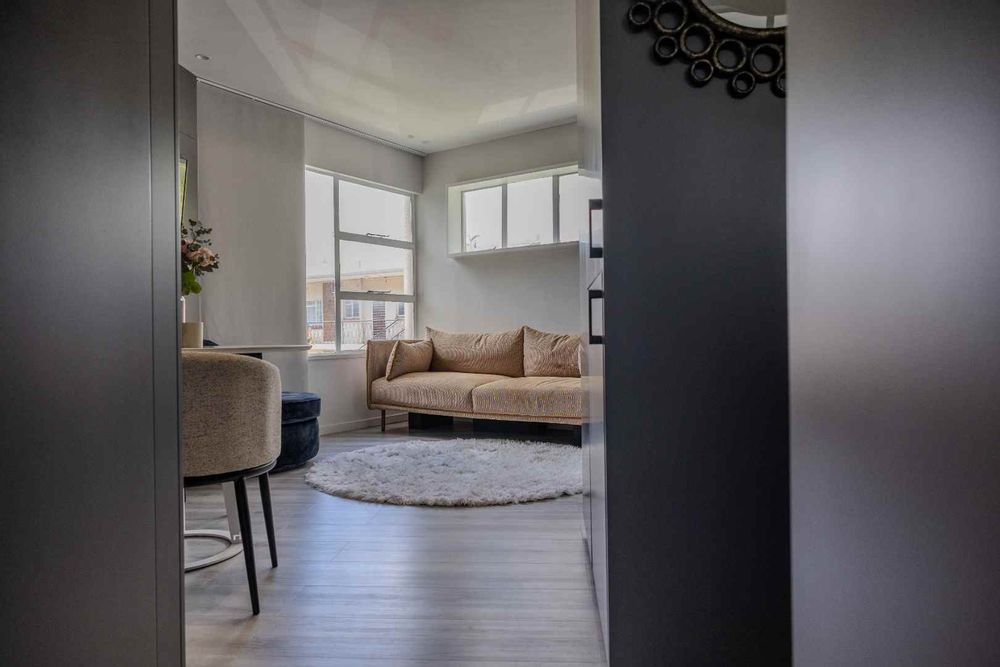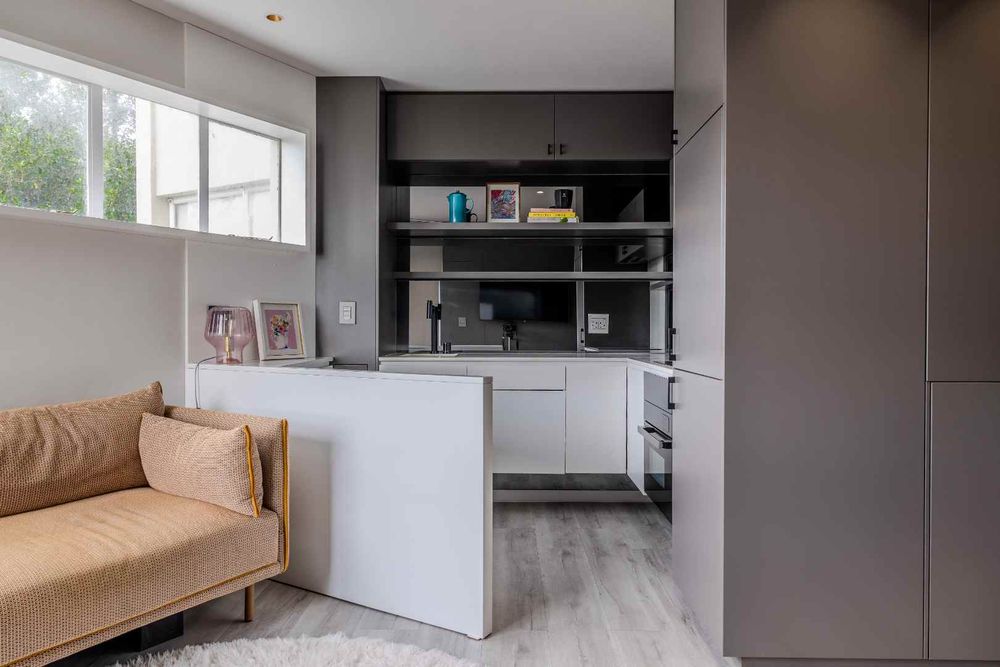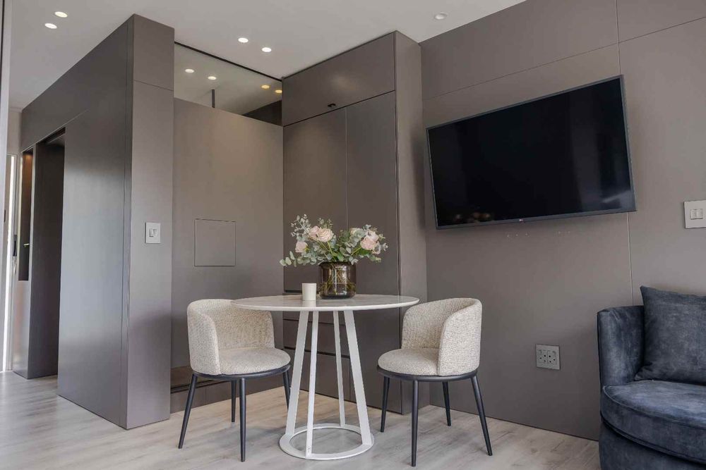The living area is inviting and versatile, with a dedicated dining nook perfectly positioned to take in the outlooks. Cleverly defined, the bedroom area offers a private retreat with ample built-in cupboards and space for a double bed, maintaining the flow of the apartment while ensuring comfort.