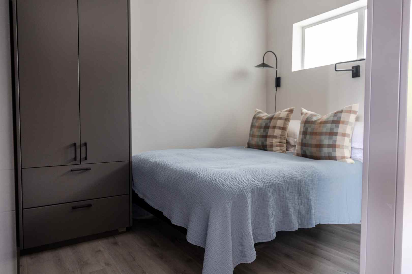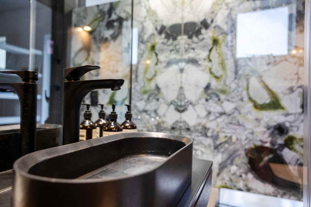 The bathroom has been beautifully finished, featuring marble shower walls and carefully chosen fixtures that add a touch of everyday luxury.