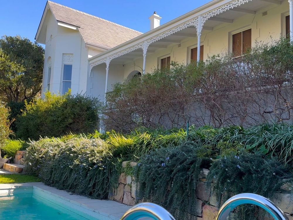 Meander through the beautiful established, tiered garden, designed by Franchesca Watson onto the “broekie lace” porch before, opening the double doors that welcome you into the home’s grand foyer - complete with a reading area and a wood-burning fireplace. The garden features a beautiful pool with a dramatic view of Table mountain.