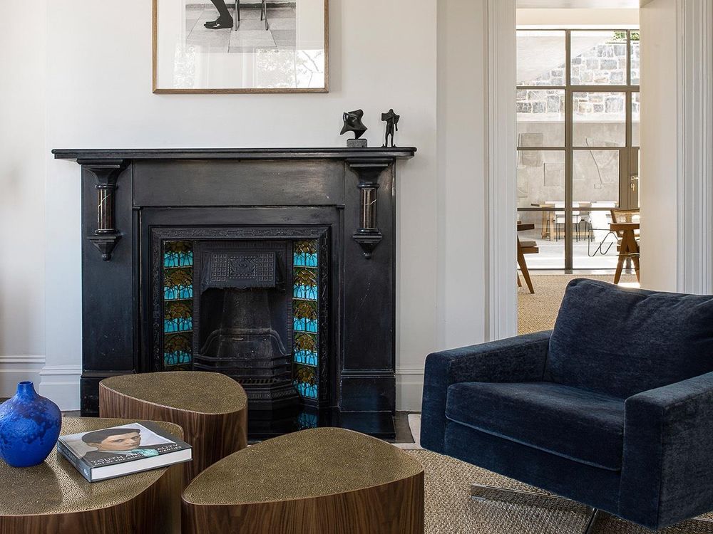 A lounge with the original, 1902 hand painted tiles of the wood burning fireplace, offers breathtaking views of the city and Table Mountain. Relax and unwind in this serene setting, appreciating the beauty around you.