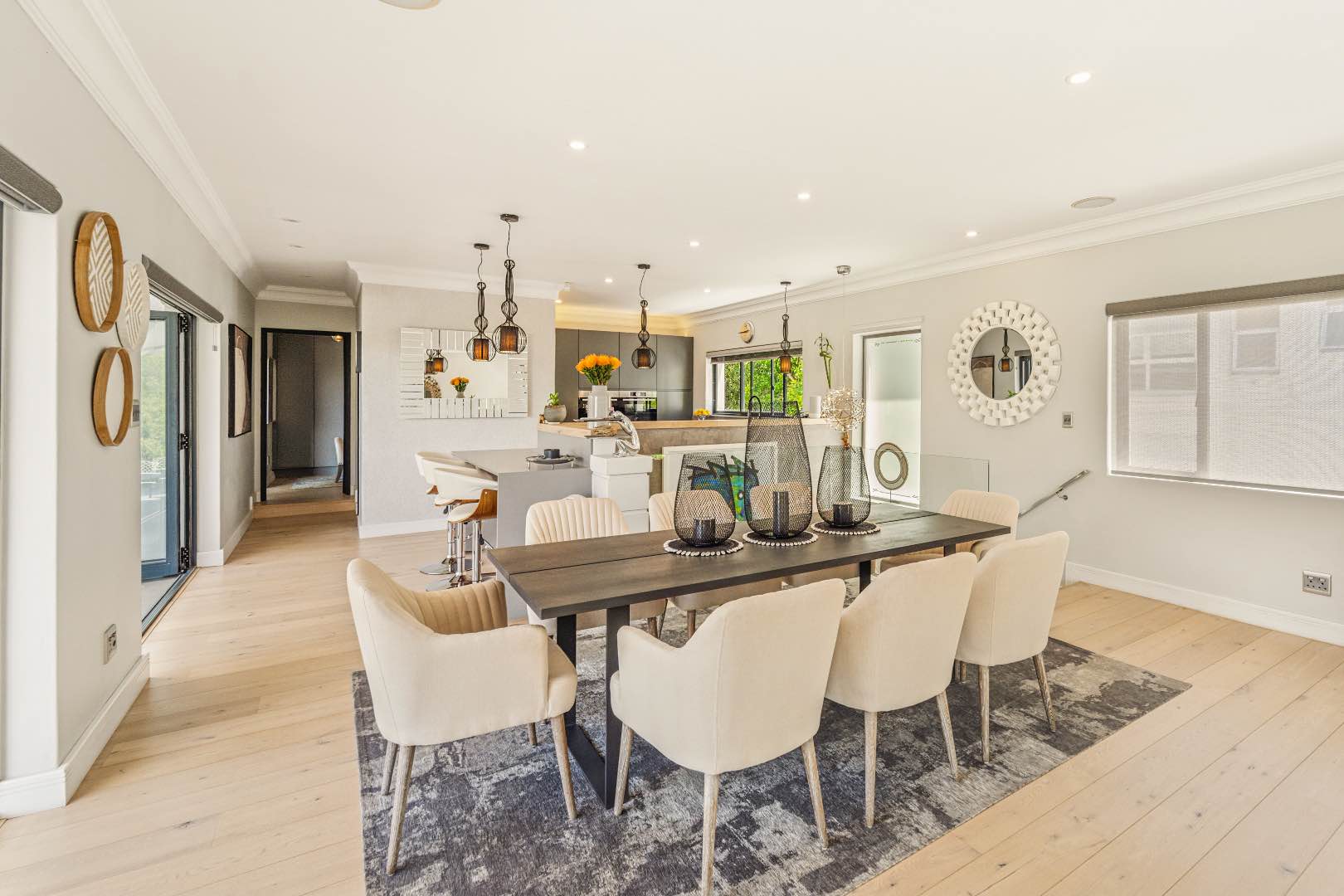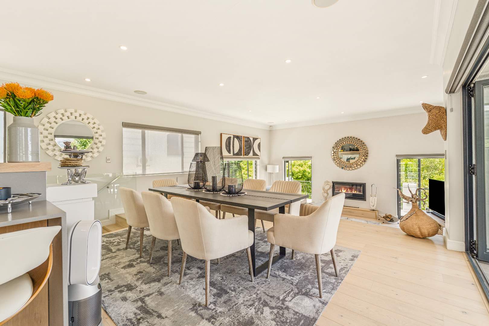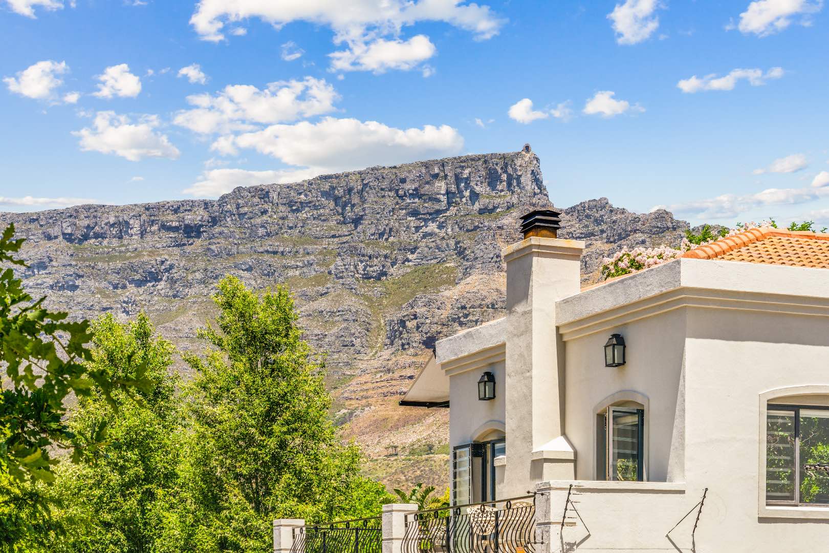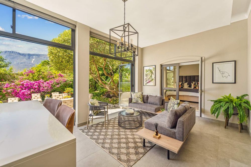 The main living area is located upstairs and features an open-plan design that seamlessly connects the stylish kitchen, dining area, and sunken lounge with a wood-burning fireplace, all bathed in natural light. This space flows effortlessly onto an outdoor terrace, where you can savour unobstructed, picture-perfect vistas of Table Mountain, the city, and the harbour.