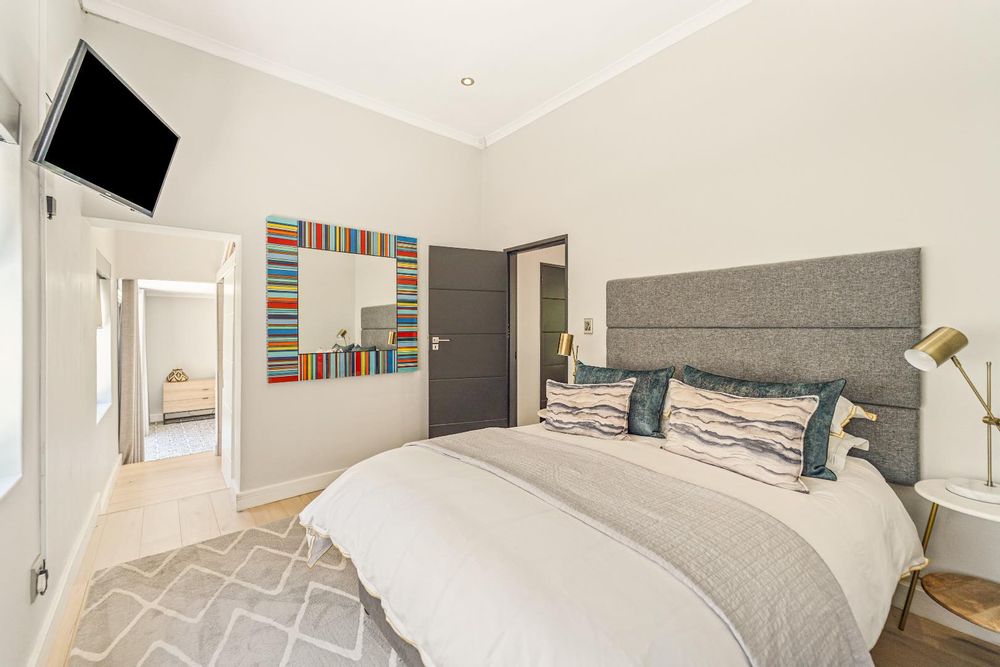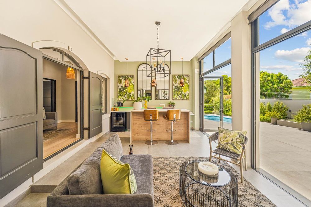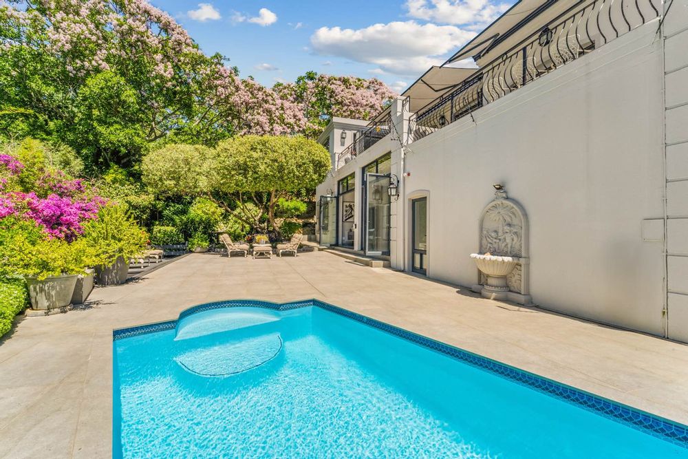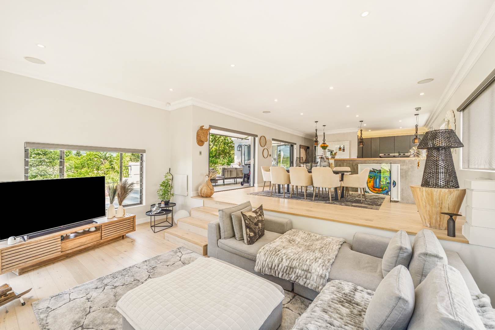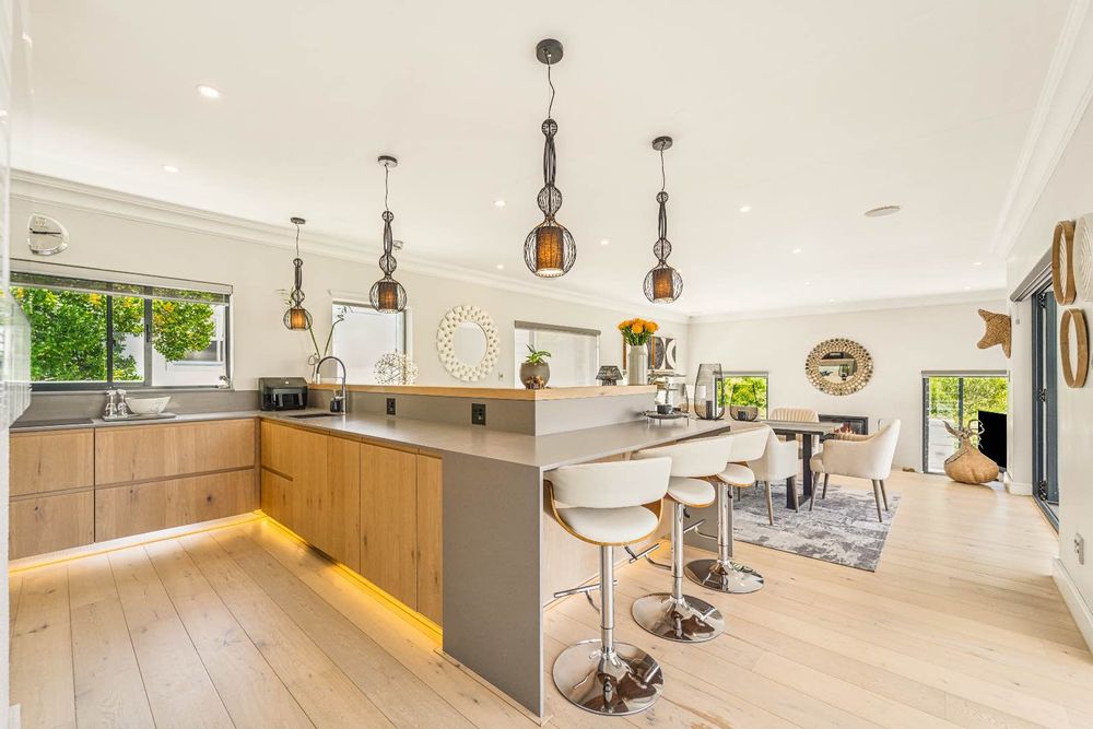 The main living area is located upstairs and features an open-plan design that seamlessly connects the stylish kitchen, dining area, and sunken lounge with a wood-burning fireplace, all bathed in natural light. This space flows effortlessly onto an outdoor terrace, where you can savour unobstructed, picture-perfect vistas of Table Mountain, the city, and the harbour.