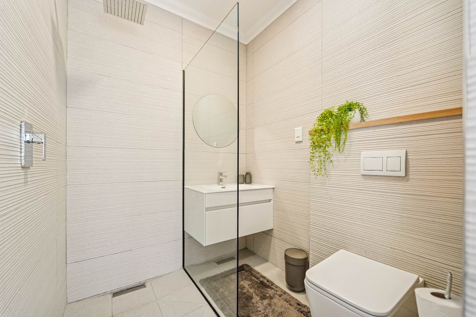 The kitchen features integrated appliances and is adorned with ambient lighting, creating a warm and inviting atmosphere. The main bedroom suite serves as a private retreat with direct access to the spacious terrace, equipped with an automated pergola—ideal for entertaining or simply relaxing. A convenient guest toilet is also located upstairs for visitors.