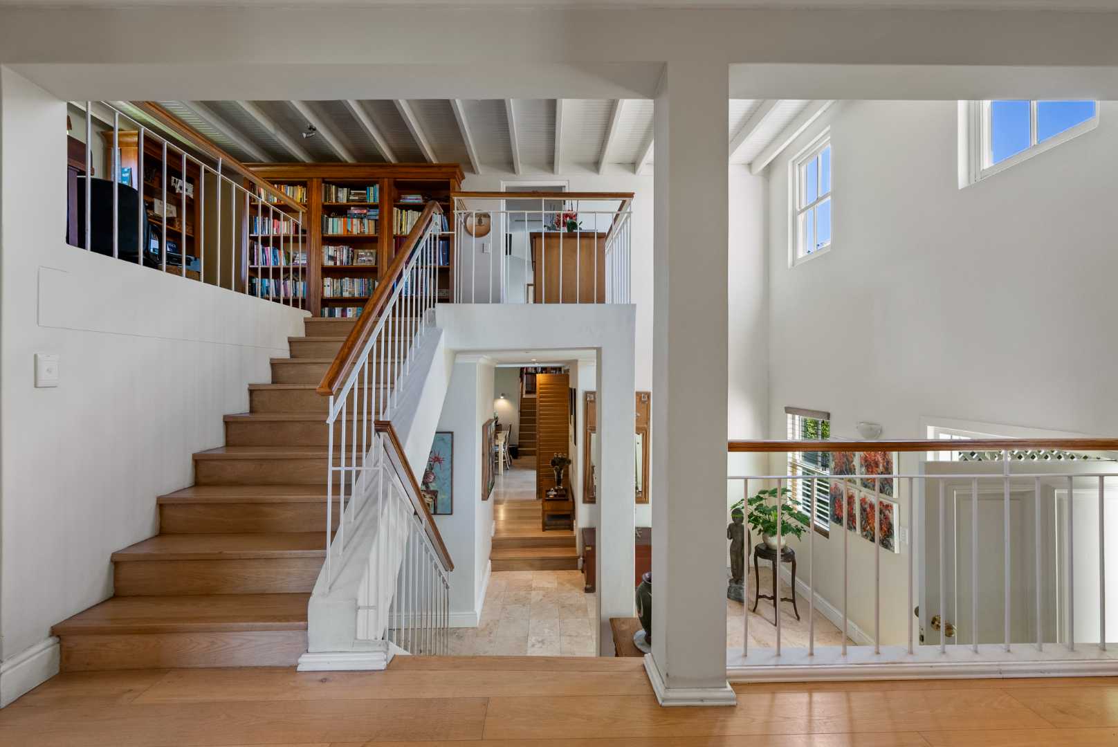 The architecture draws from Cape Cod and Georgian influences, with French doors throughout the home opening to leafy garden corners, sunny decks, and sweeping views of the city and mountains. The north-facing aspect ensures natural warmth and light year-round, while engineered wood floors and fireplaces add to the cosy atmosphere.