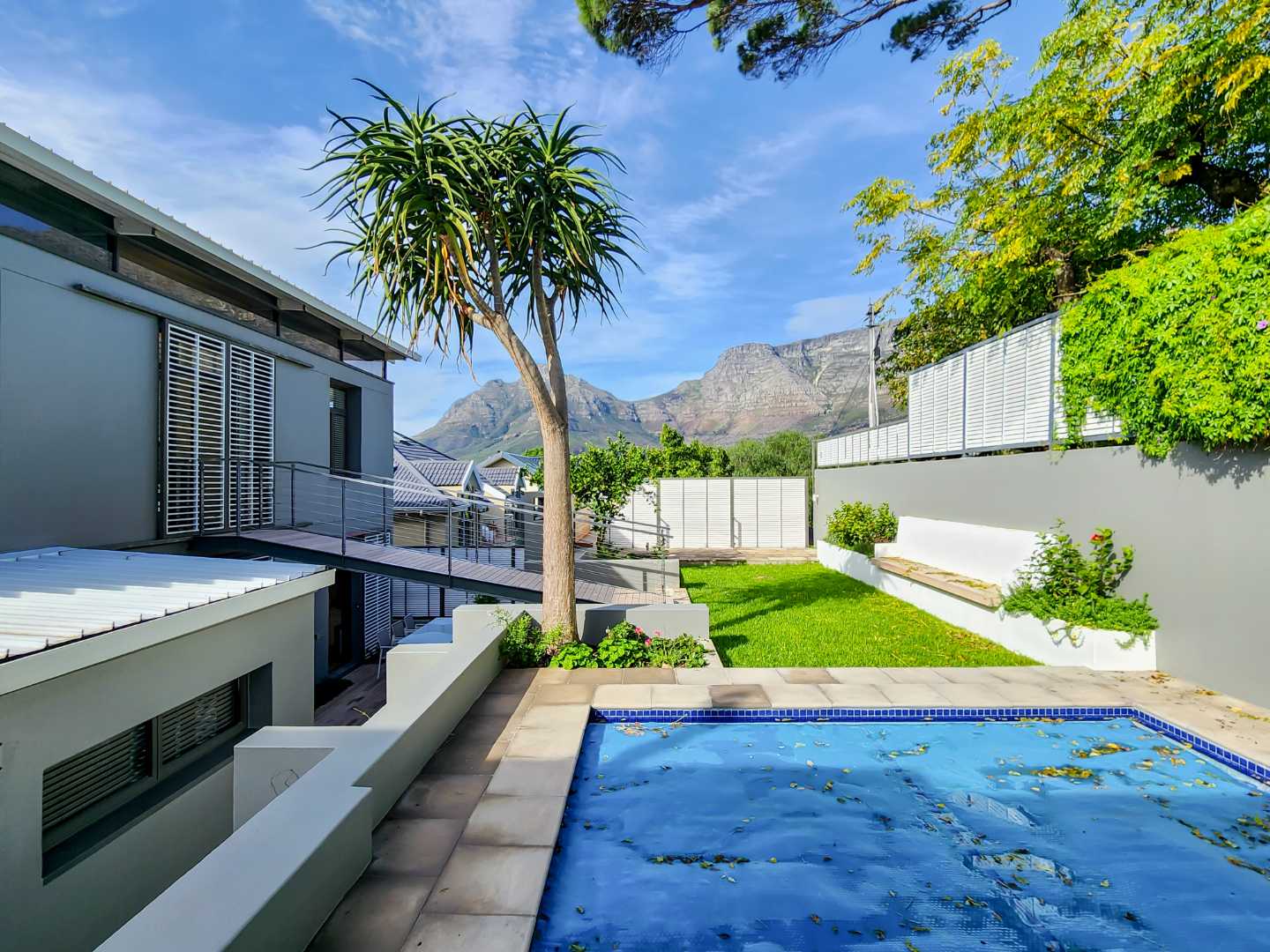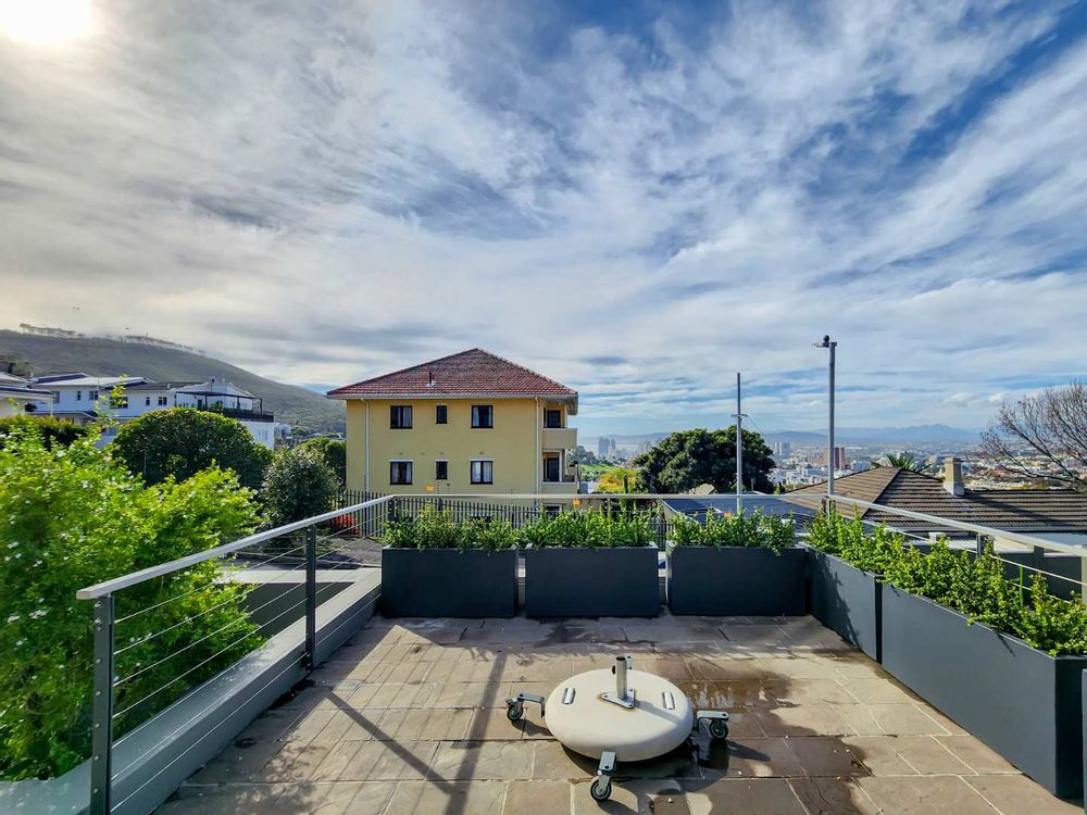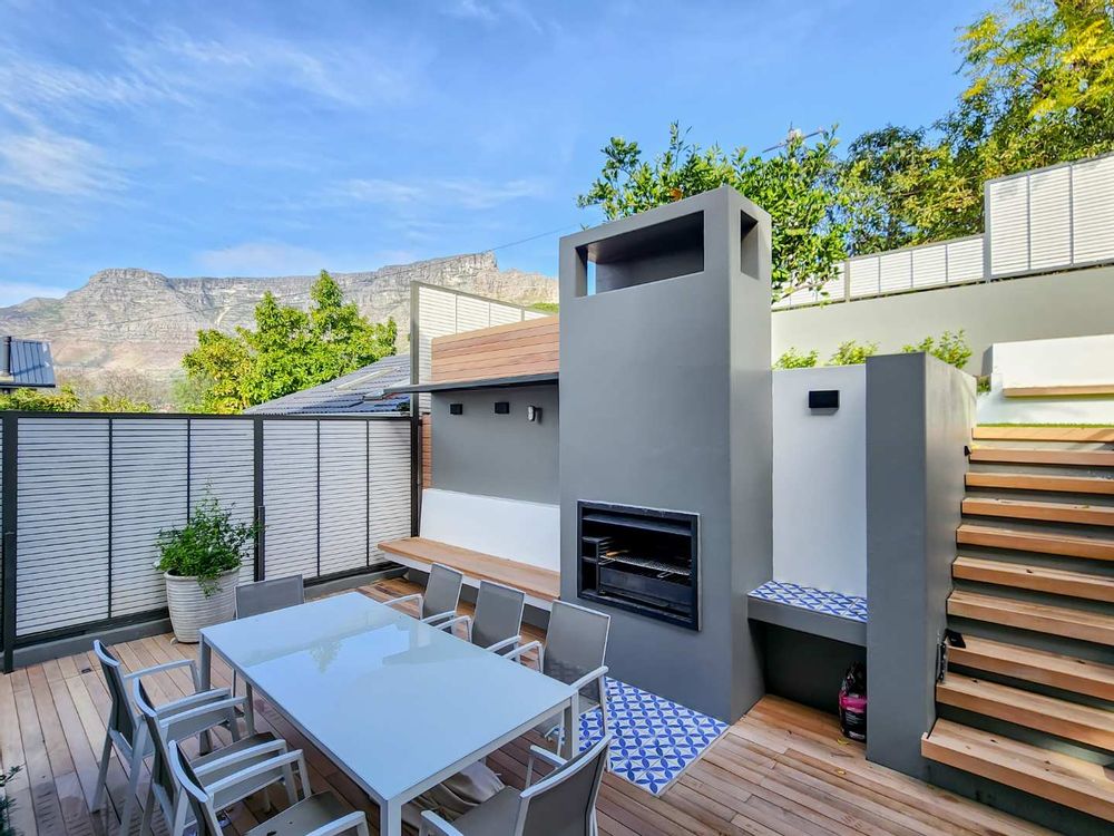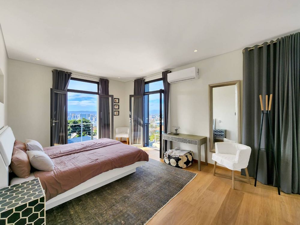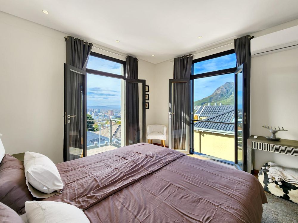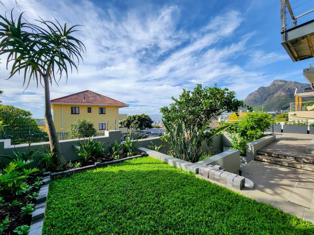 Enjoy breathtaking views of Table Mountain from the terraces and landscaped garden. The pool offers a cooling retreat in summer and is equipped with heating for use during Cape Town’s crisp winter evenings. Additional features include solar panels and a Victron battery backup system, ensuring uninterrupted comfort.