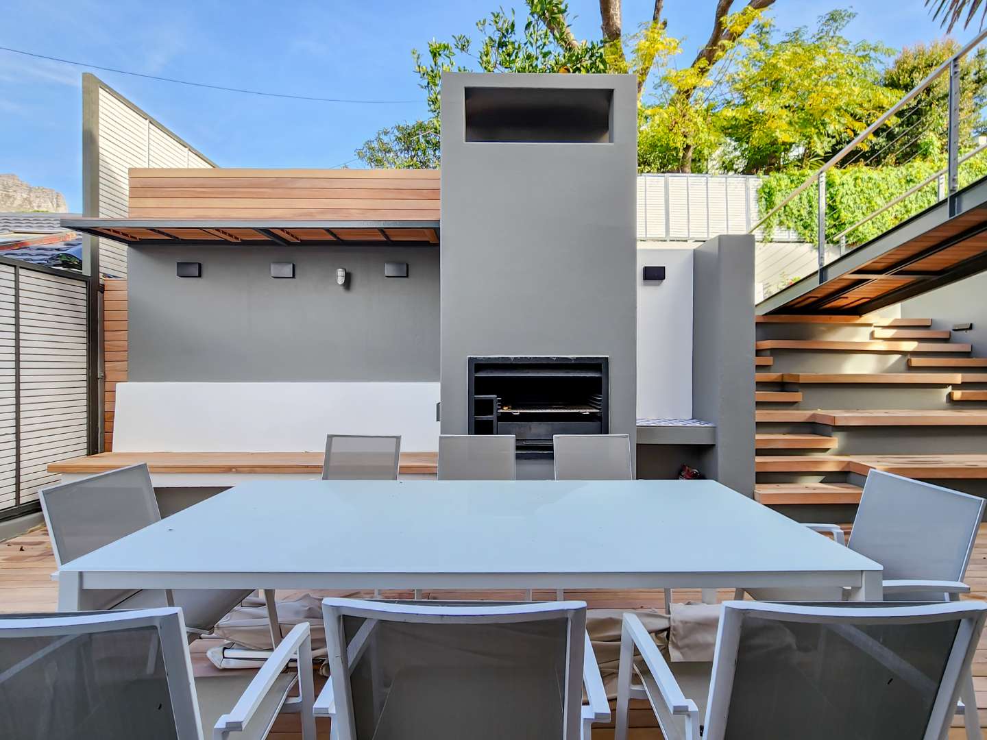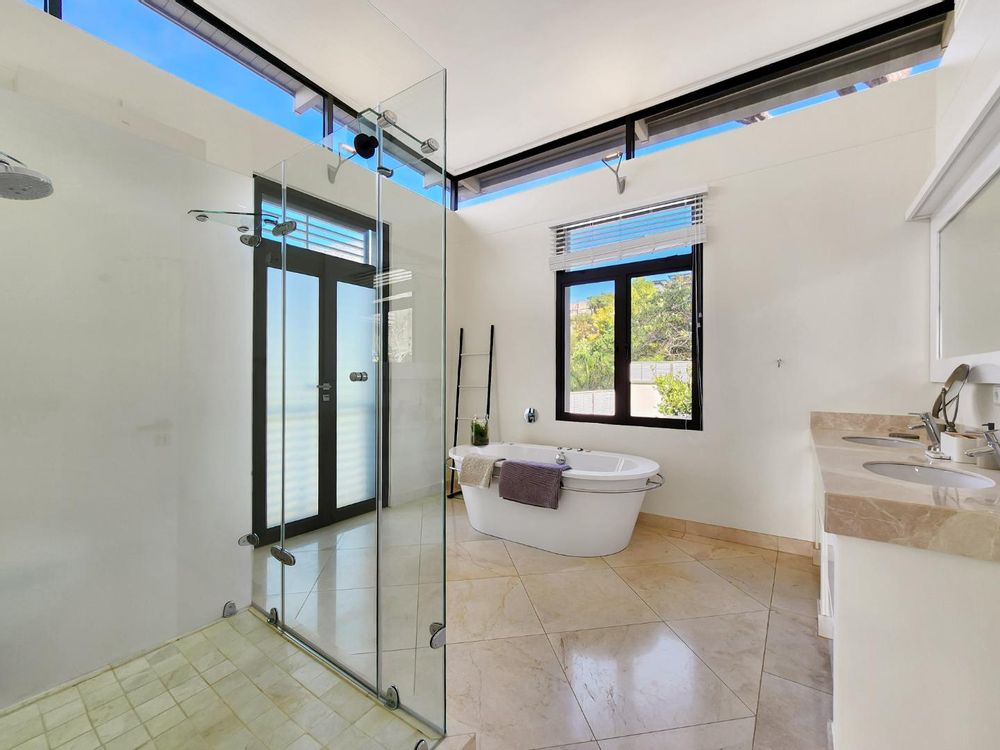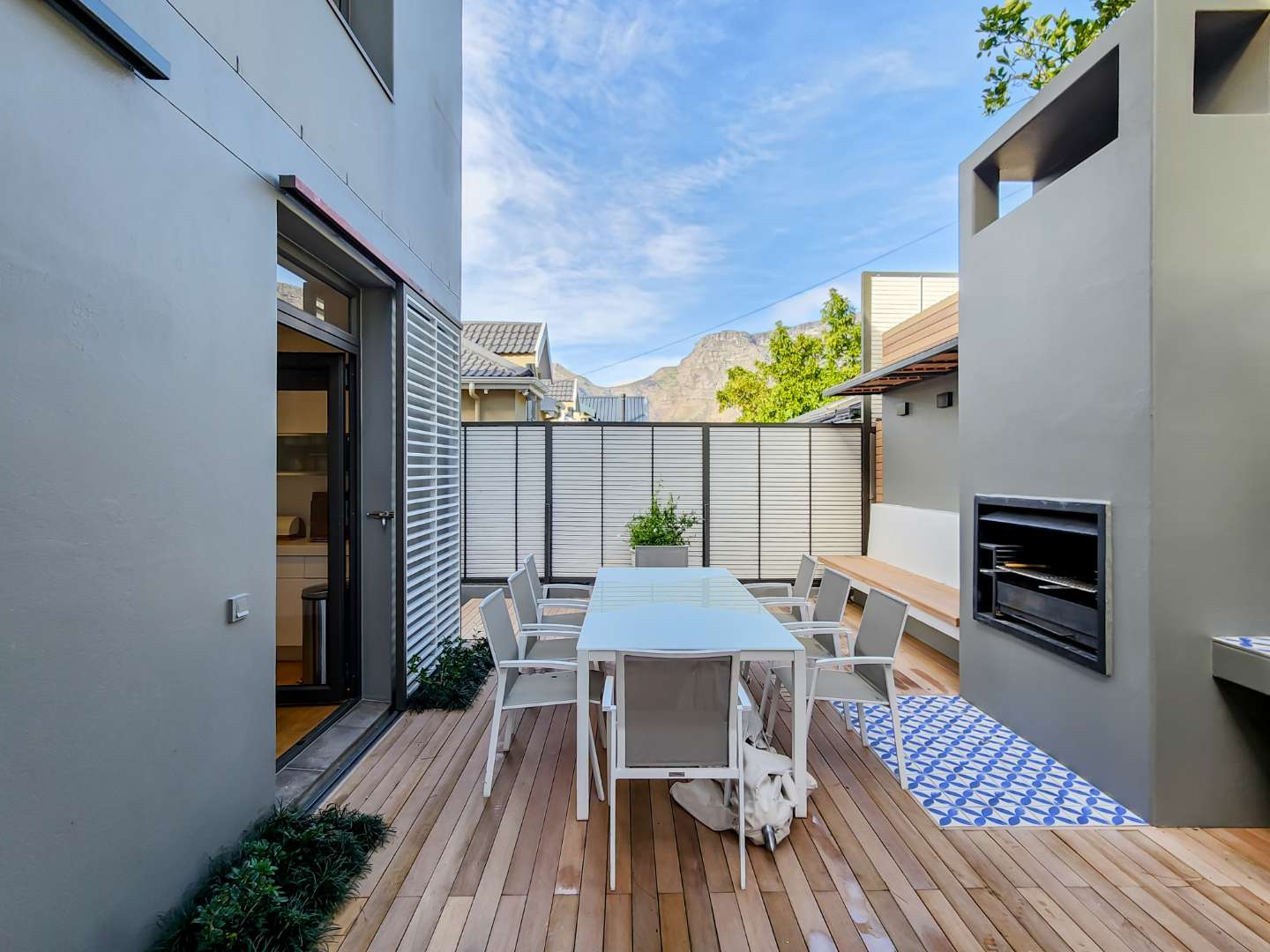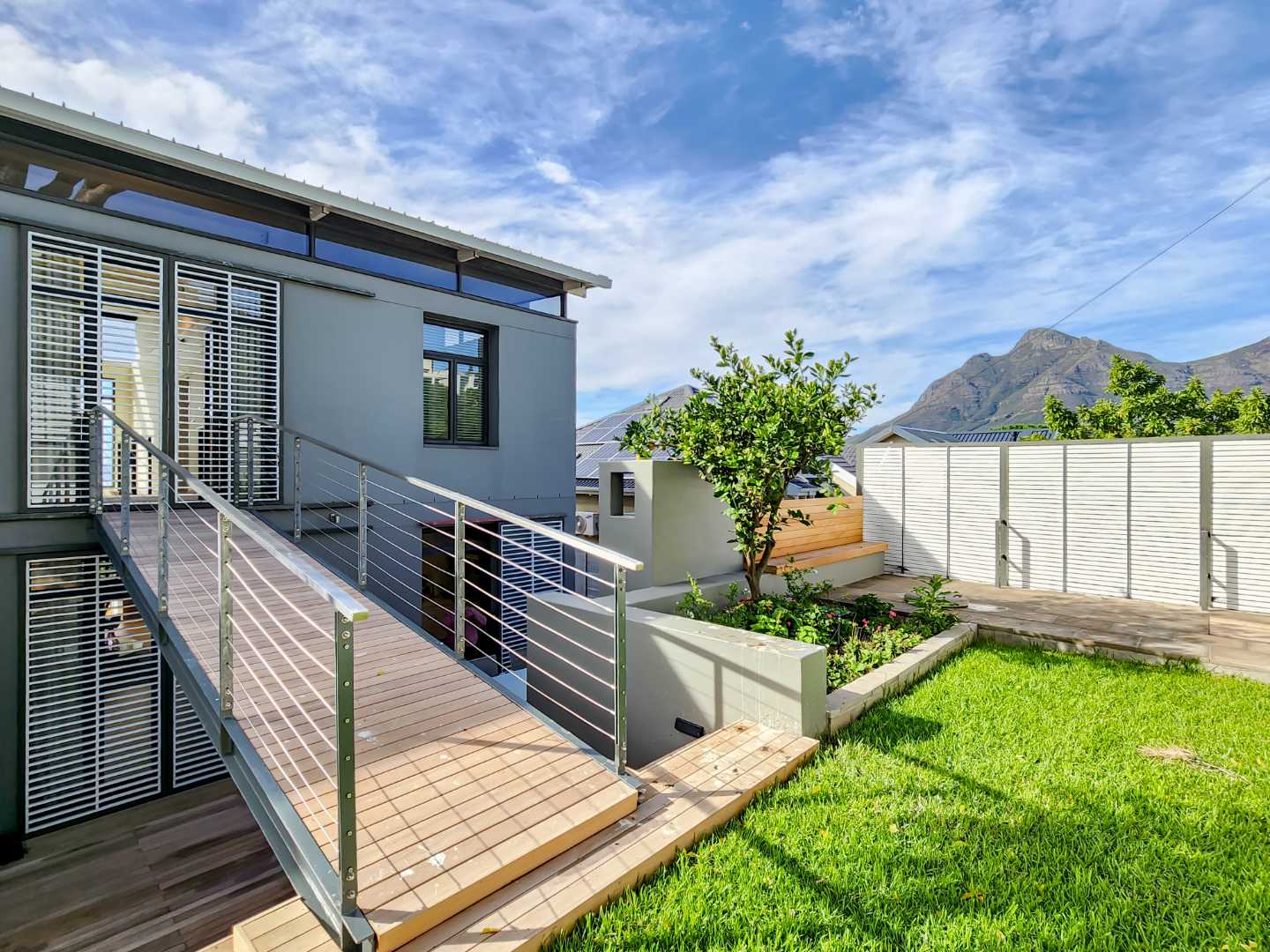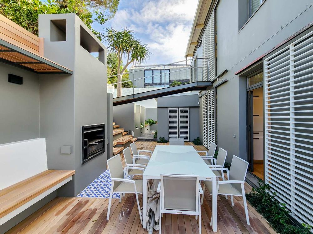 Enjoy breathtaking views of Table Mountain from the terraces and landscaped garden. The pool offers a cooling retreat in summer and is equipped with heating for use during Cape Town’s crisp winter evenings. Additional features include solar panels and a Victron battery backup system, ensuring uninterrupted comfort.