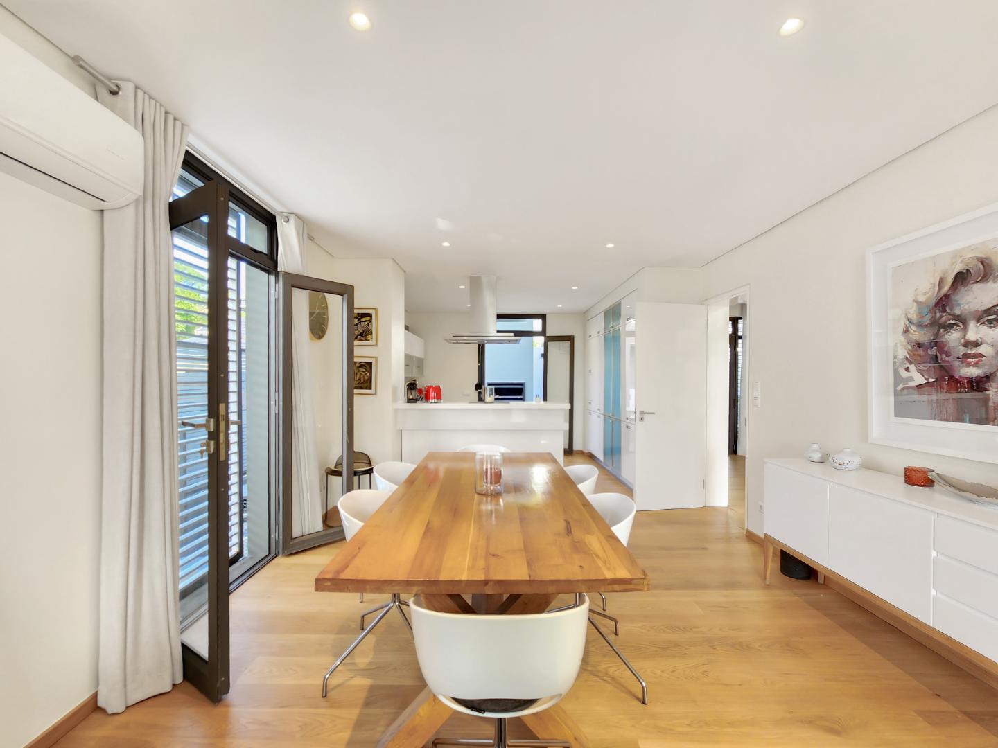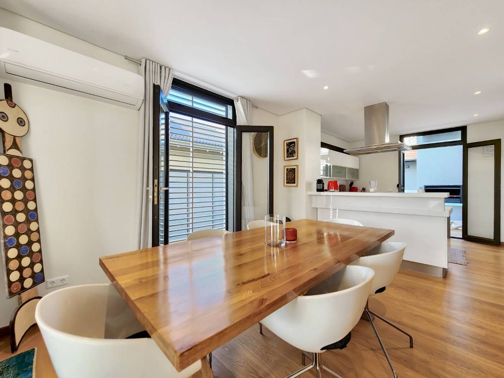 This beautifully designed contemporary home is perfectly positioned just a short walk from the German International School and the vibrant energy of Kloof Street. With a light and airy feel throughout, the home provides a tranquil escape from the hustle of city life, while still offering all the comforts needed for modern, practical living. Ideal for urban family life, it features two spacious en-suite master bedrooms upstairs, as well as two additional bedrooms downstairs sharing a bathroom. A sunlit study overlooks the pool and includes generous built-in cupboards. The kitchen, sleek and functional, caters equally well to casual family meals or effortless entertaining.