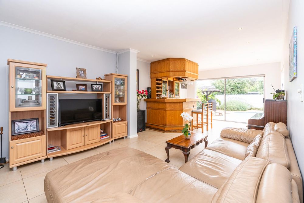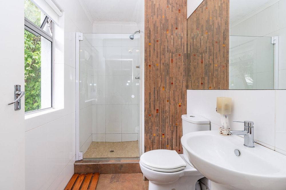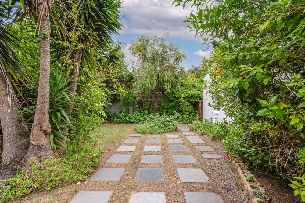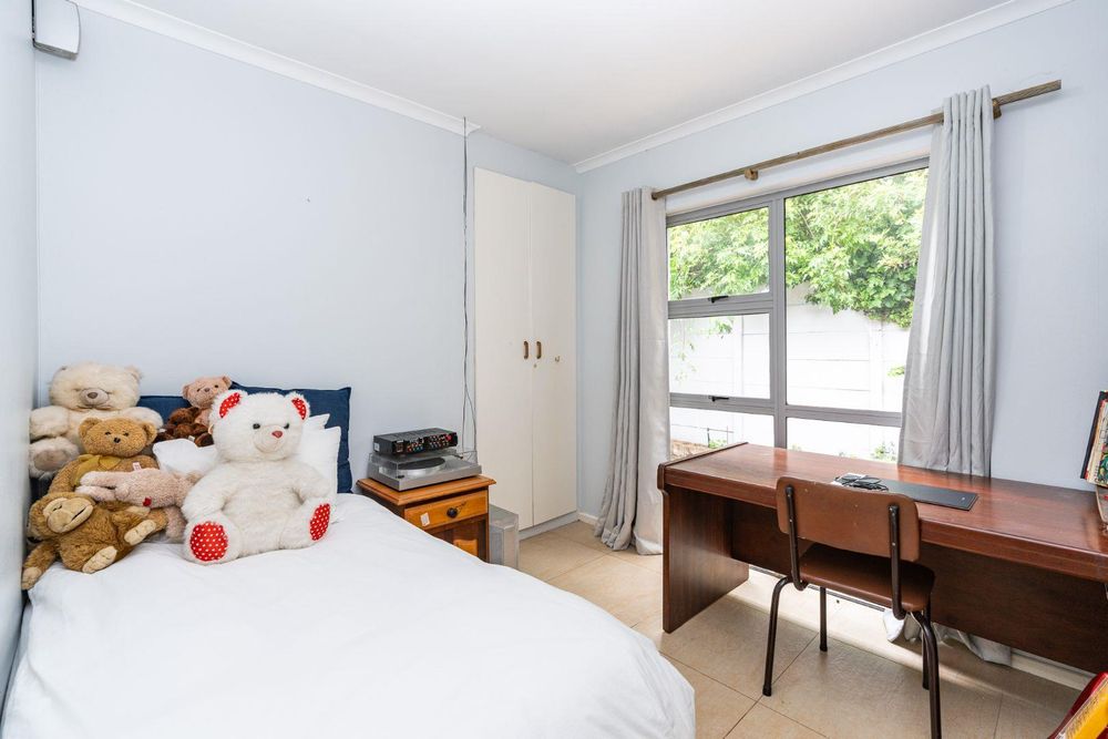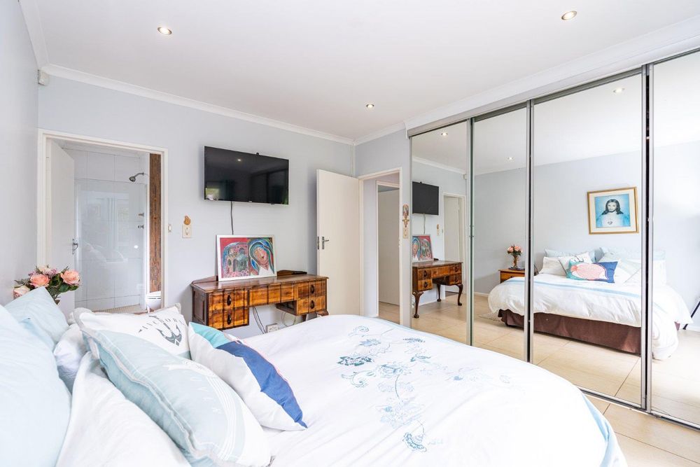 The tiled family bathroom serves as a retreat, showcasing a corner bath, toilet, and basin. Three bedrooms, each featuring Built-In Cupboards, provide comfortable living spaces. The main bedroom offers added luxury with an en-suite bathroom and a convenient door leading out to the garden, seamlessly connecting indoor and outdoor living.