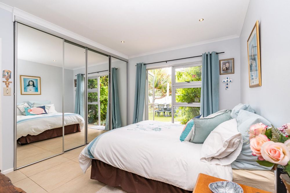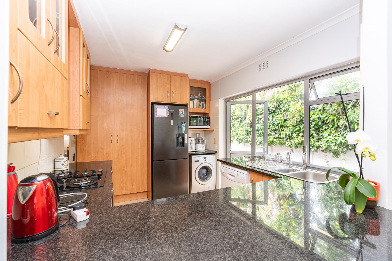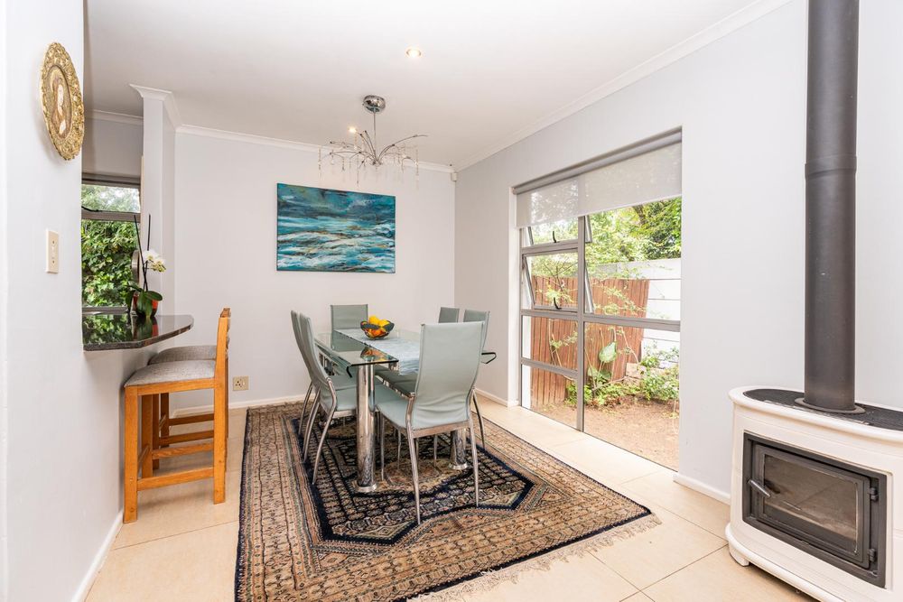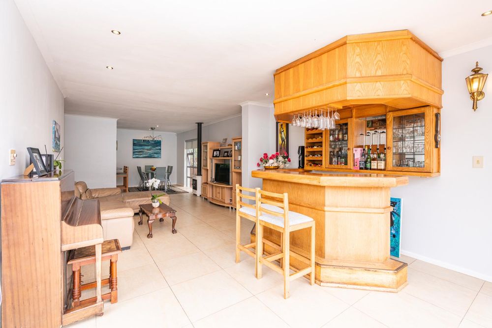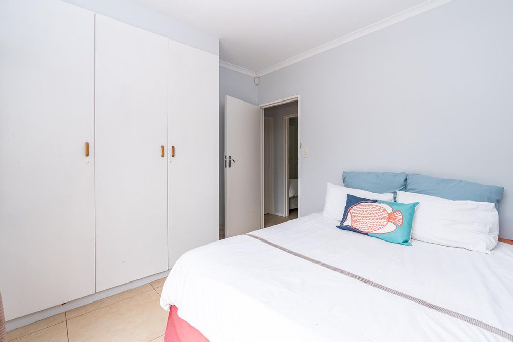 The tiled family bathroom serves as a retreat, showcasing a corner bath, toilet, and basin. Three bedrooms, each featuring Built-In Cupboards, provide comfortable living spaces. The main bedroom offers added luxury with an en-suite bathroom and a convenient door leading out to the garden, seamlessly connecting indoor and outdoor living.