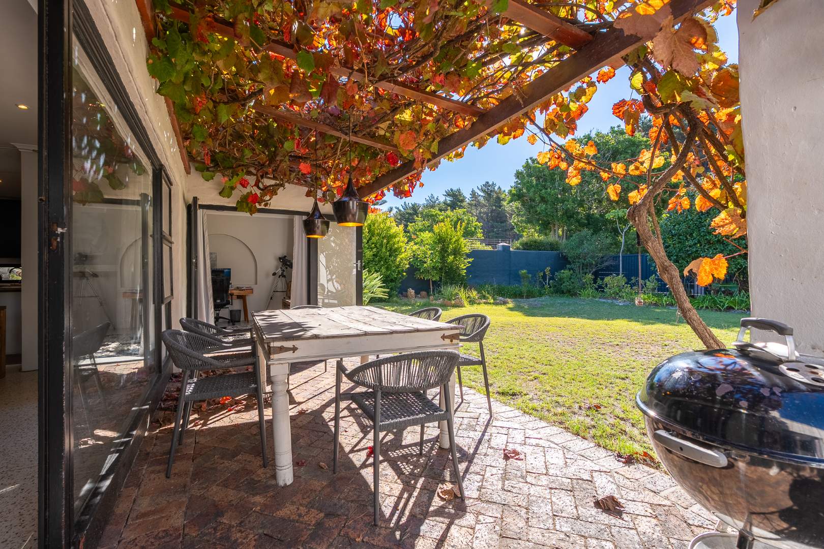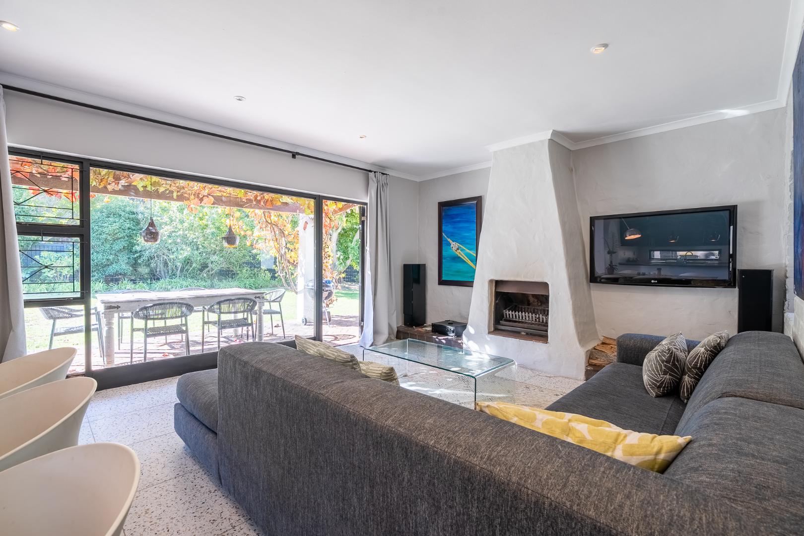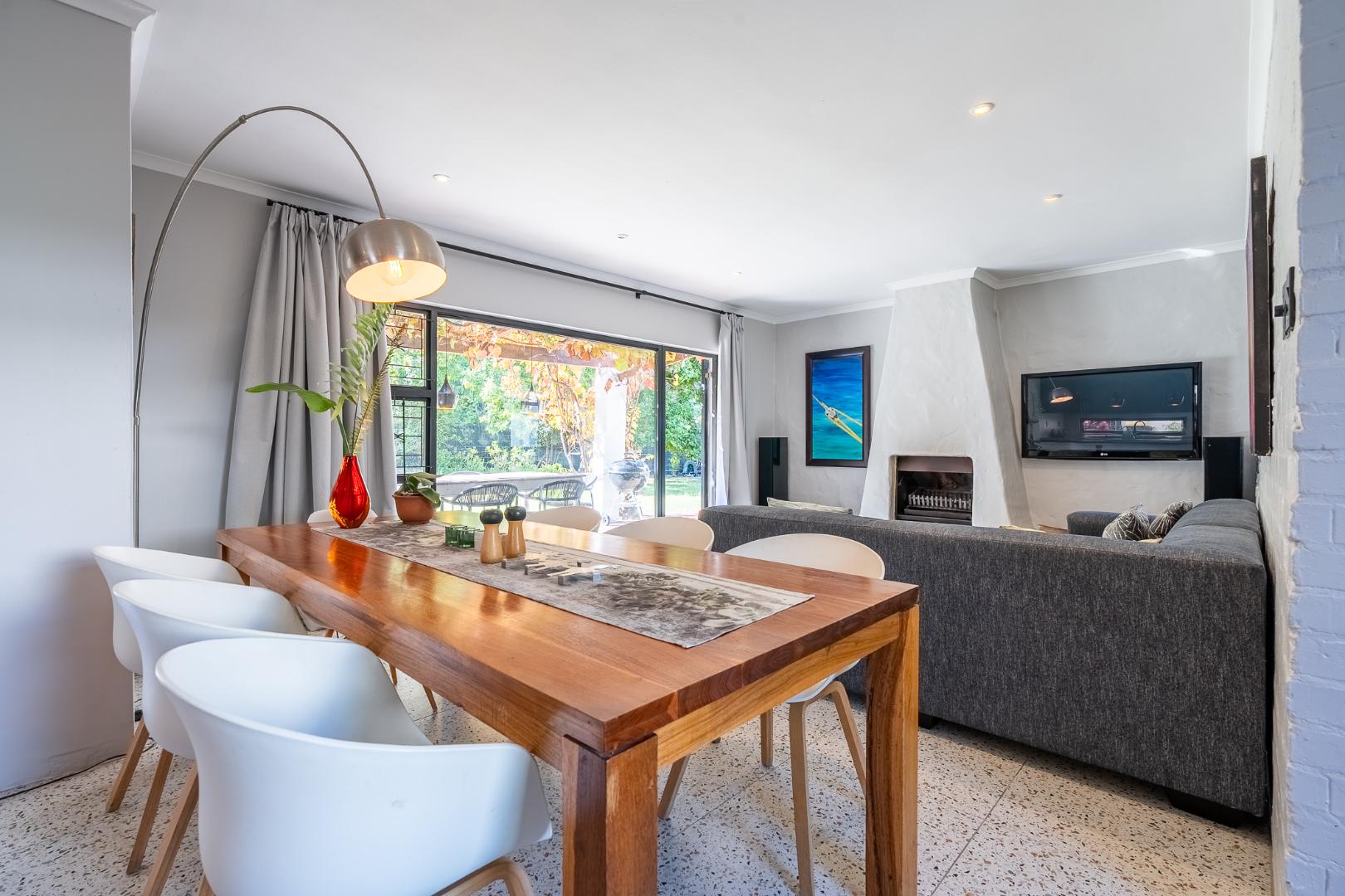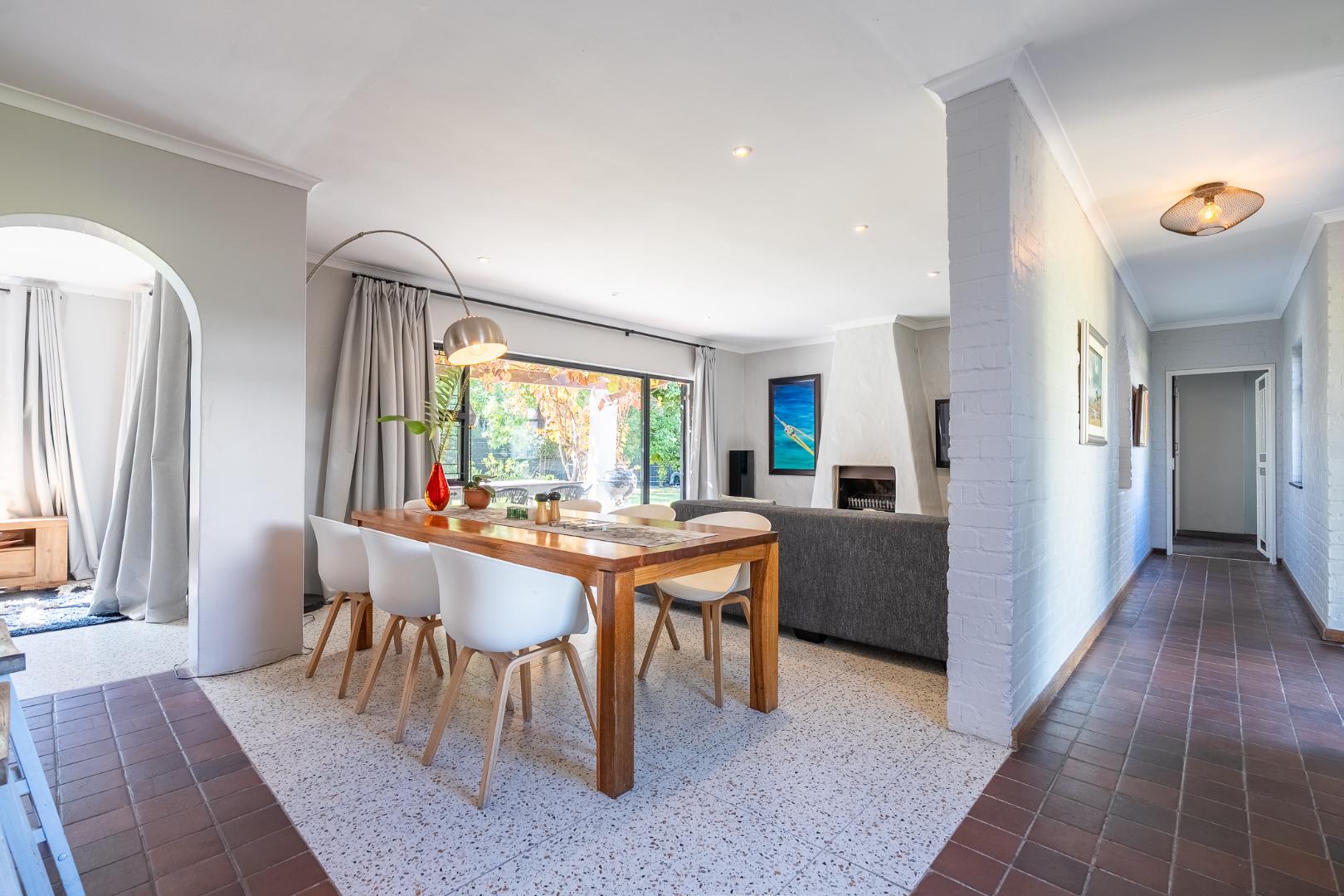 The driveway can accommodate multiple vehicles with auto gate access and intercom system. This family home offers great flow to the garden (with Borehole), generous enough for a game of soccer or cricket while Mom watches from the vine-covered patio. You'll love the expansive living space and open plan kitchen. The comfy lounge has a fireplace for those cosy Winter evenings.