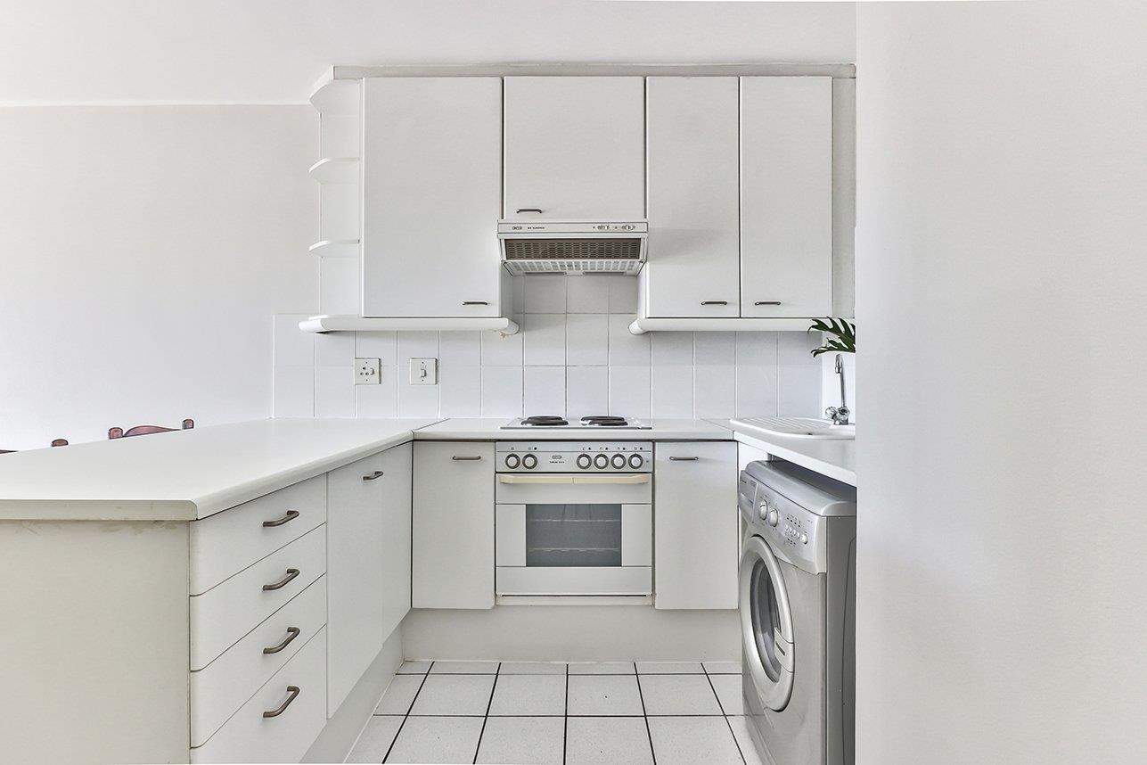 The apartment features an open-plan kitchen equipped with a stove, hob, and oven, along with ample cupboard & counter space and plumbing for a washing machine. The spacious bathroom includes a shower, toilet, and basin. The studio is fitted with vinyl flooring and opens onto a private patio with partial views of the complex’s communal pool.