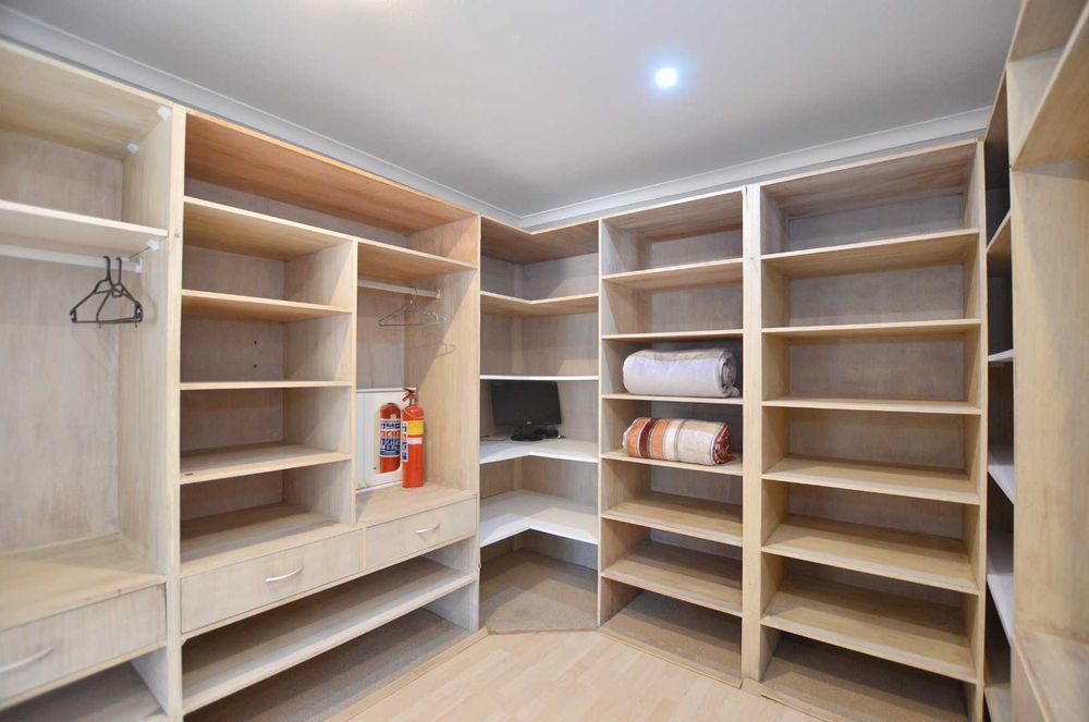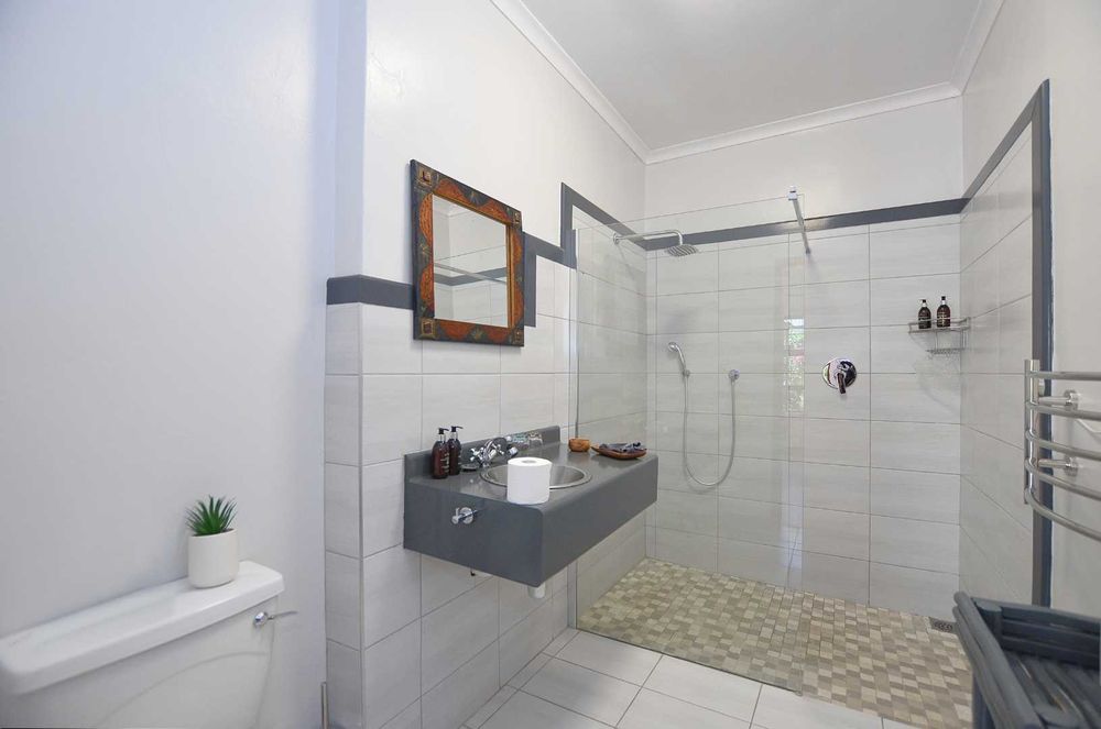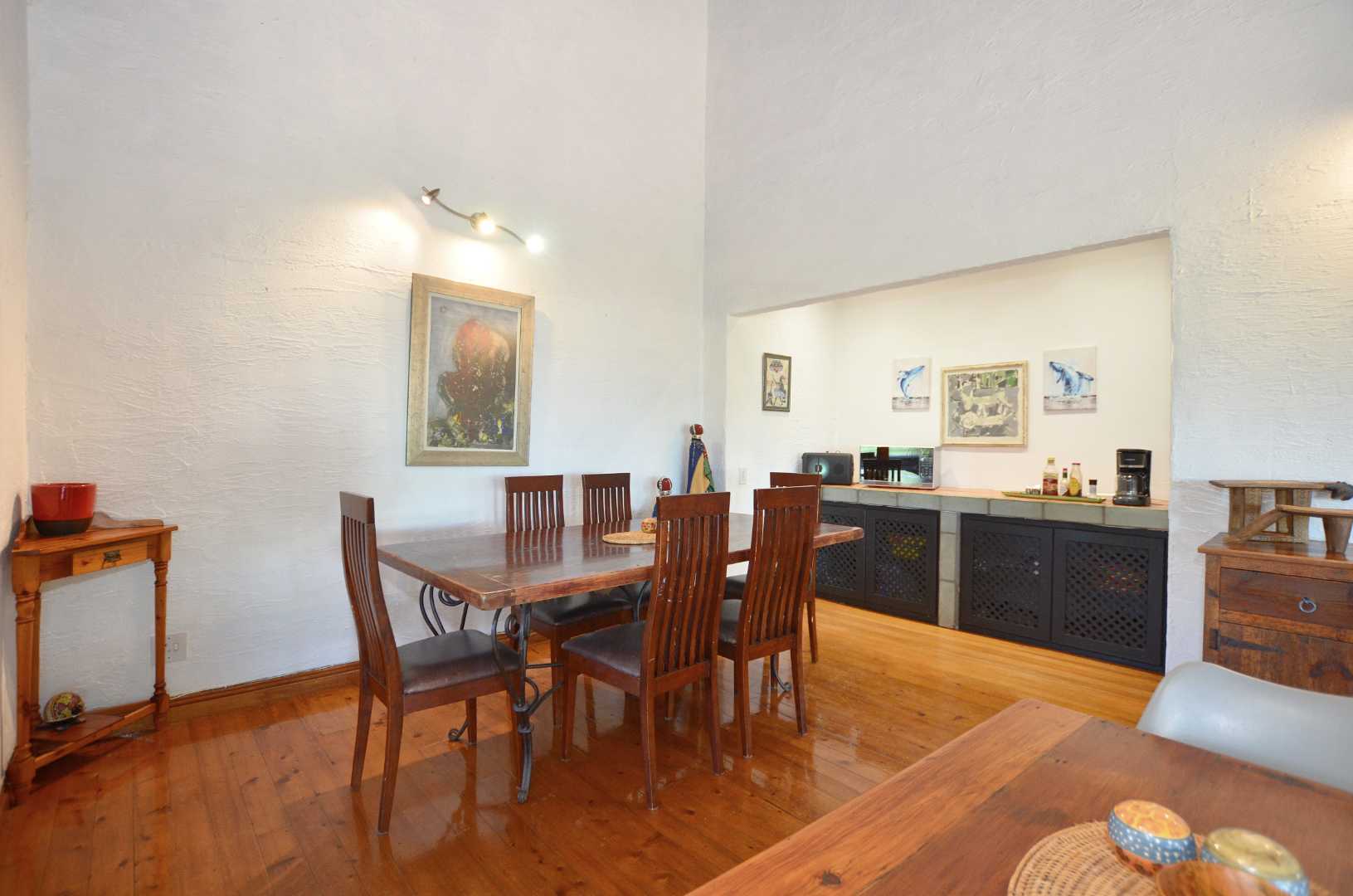 Dine indoors or step out onto the sunny patio off the lounge, where you can enjoy meals overlooking the picturesque garden. The outdoor space is enhanced by a lapa and a generously sized pool, perfect for cooling off on lazy summer days. Mature trees provide privacy and tranquility, making this section of the property an ideal sanctuary for relaxation.