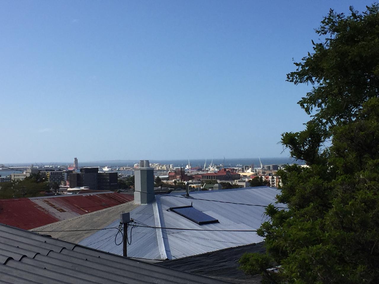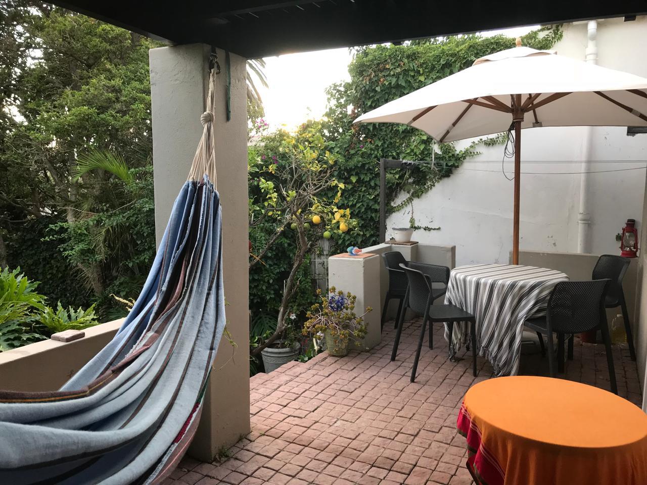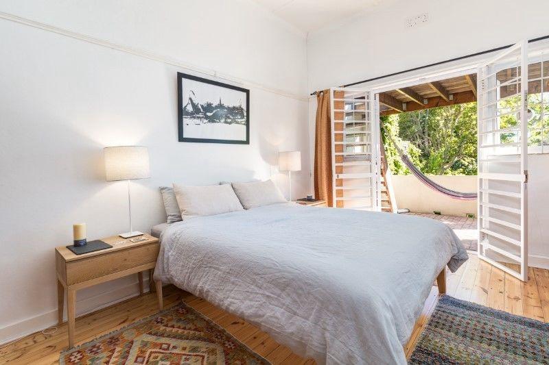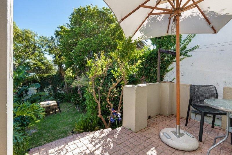 The living room features a closed wood-burning fireplace, providing warmth in winter, while in summer, the separate kitchen flows out onto a sunbathed patio and an exceptionally large and lush garden. This outdoor space is perfect for a morning coffee, alfresco dinners, or simply relaxing under one of the tree's —a peaceful and private oasis. The home also boasts a small outdoor decked area, accessed via a staircase , offering phenomenal north-facing views of the ocean, harbor, Devil's Peak, and Lion's Head Mountain.