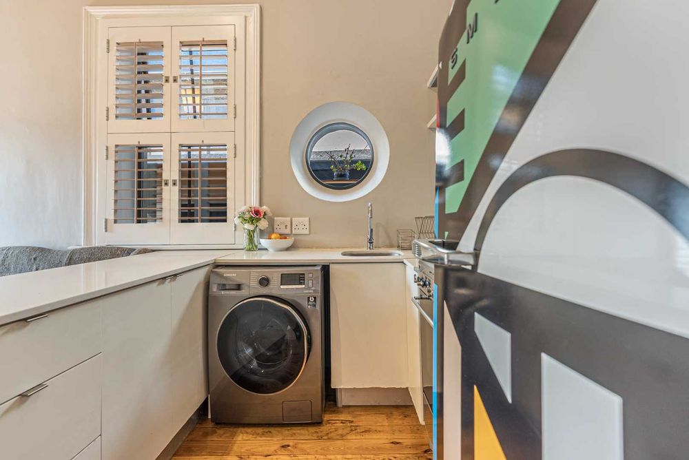 The kitchen is fitted with premium Smeg appliances — including a gas cooker and refrigerator — alongside a Samsung 9.6kg washer/dryer, providing convenience and durability for both long- and short-term stays.