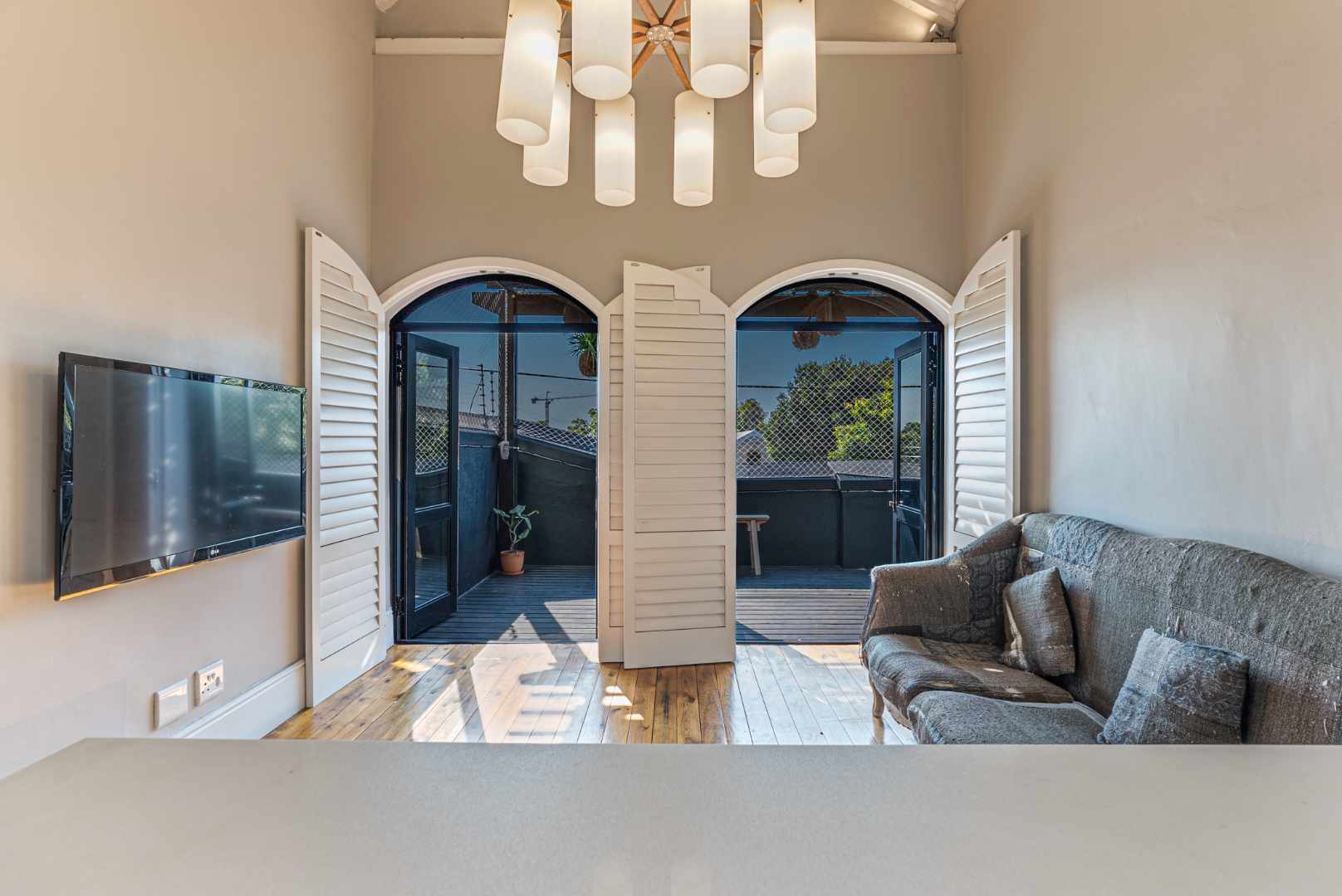Warm wooden floors, high ceilings, and refined design elements define the open-plan living area, which flows effortlessly through French doors to a covered private deck — an inviting, low-maintenance outdoor space suitable for year-round enjoyment.